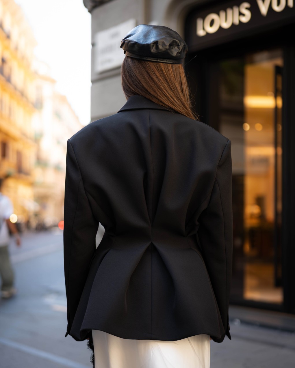 Elegante blazer sartoriale con design strutturato e dettaglio plissettato sul retro. Realizzato in pregiato tessuto di lana con fodera interna, presenta una silhouette moderna caratterizzata da spalle definite e vita sagomata. La lavorazione artigianale e i dettagli raffinati rendono questo capo perfetto per look sofisticati sia formali che casual-chic.