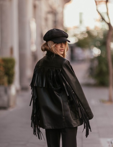 Giacca in eco pelle dal design contemporaneo con distintive frange applicate sulle maniche e sul fondo. Taglio oversize con chiusura a bottone singolo e tasche a toppa, realizzata in morbida pelle di alta qualità. La silhouette rilassata e i dettagli western la rendono perfetta per look casual-chic e outfit dal carattere distintivo.