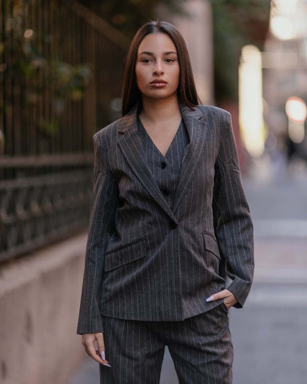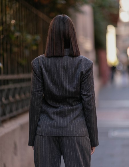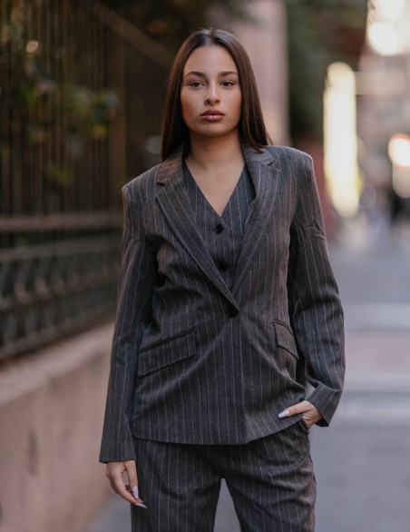 Blazer elegante dal taglio sartoriale con raffinata fantasia gessata. Realizzato in tessuto resistente con finitura premium, presenta un design monopetto con bottone singolo e tasche a filetto. La vestibilità regular e la struttura semi-foderata garantiscono comfort e una silhouette moderna, ideale sia per l'ufficio che per occasioni formali.