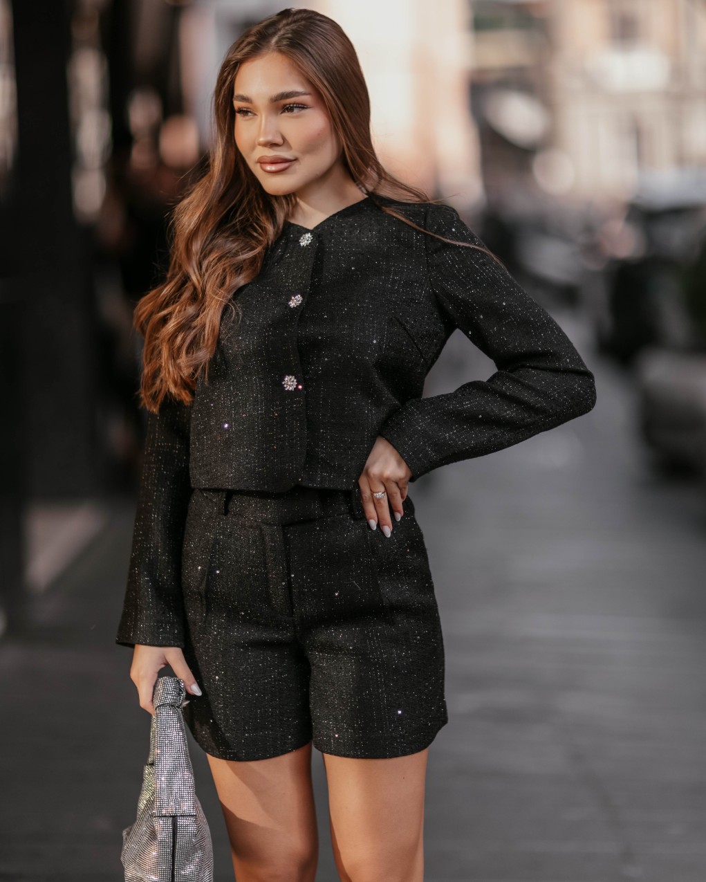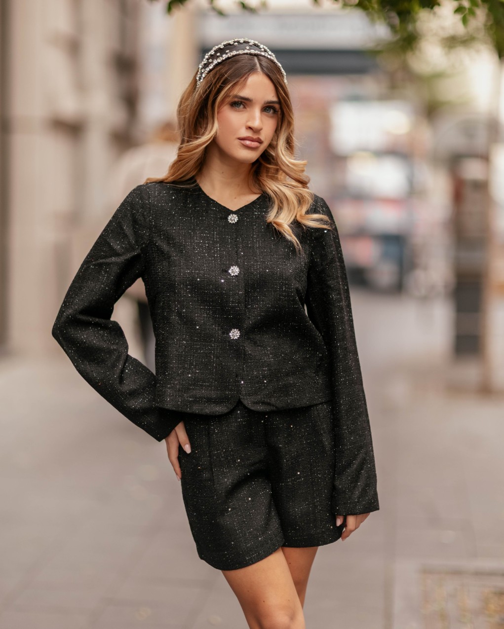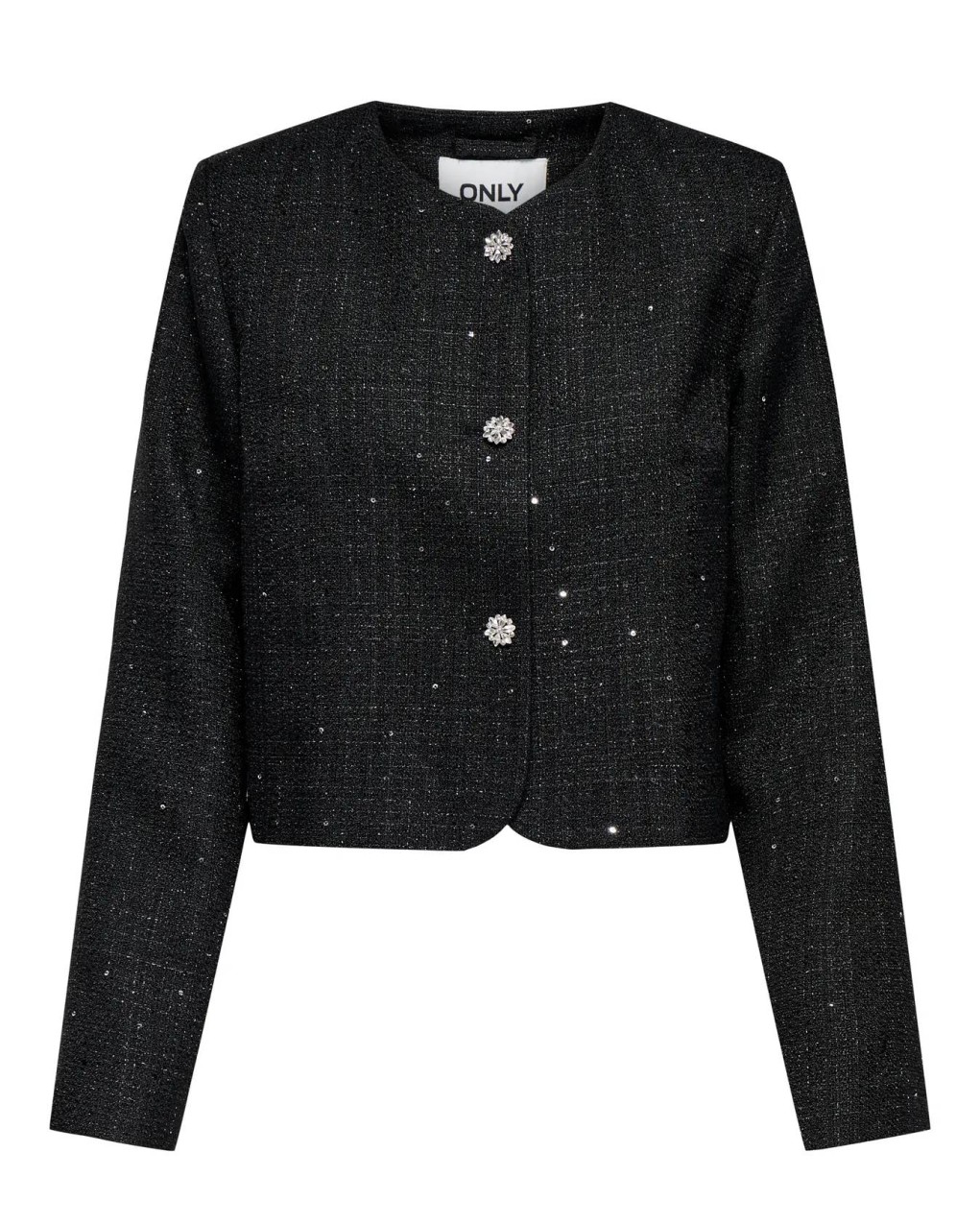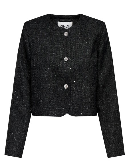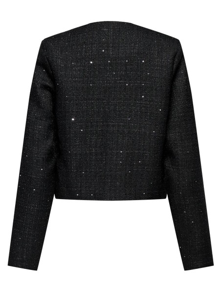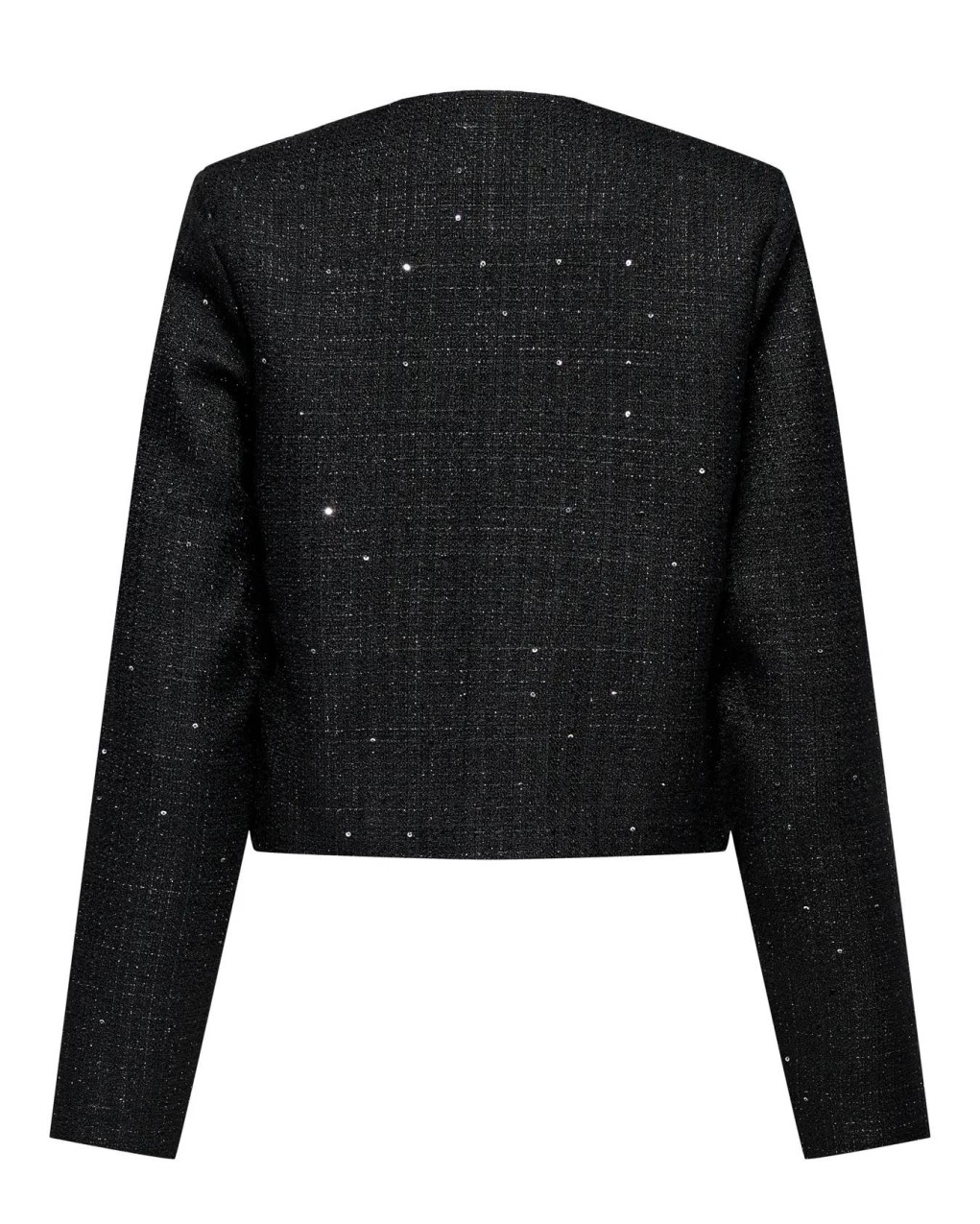 Giacca realizzata in maglia luminosa con effetto glitter che dona un aspetto sofisticato e glamour. Ideale per chi cerca un look raffinato e contemporaneo con un tocco di brillantezza.