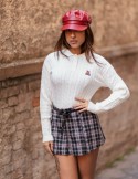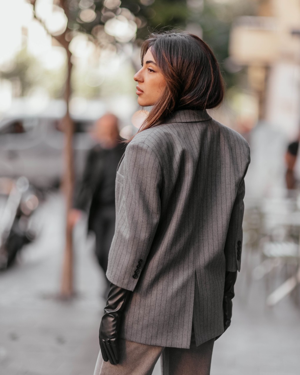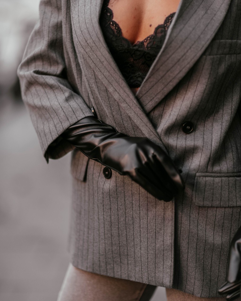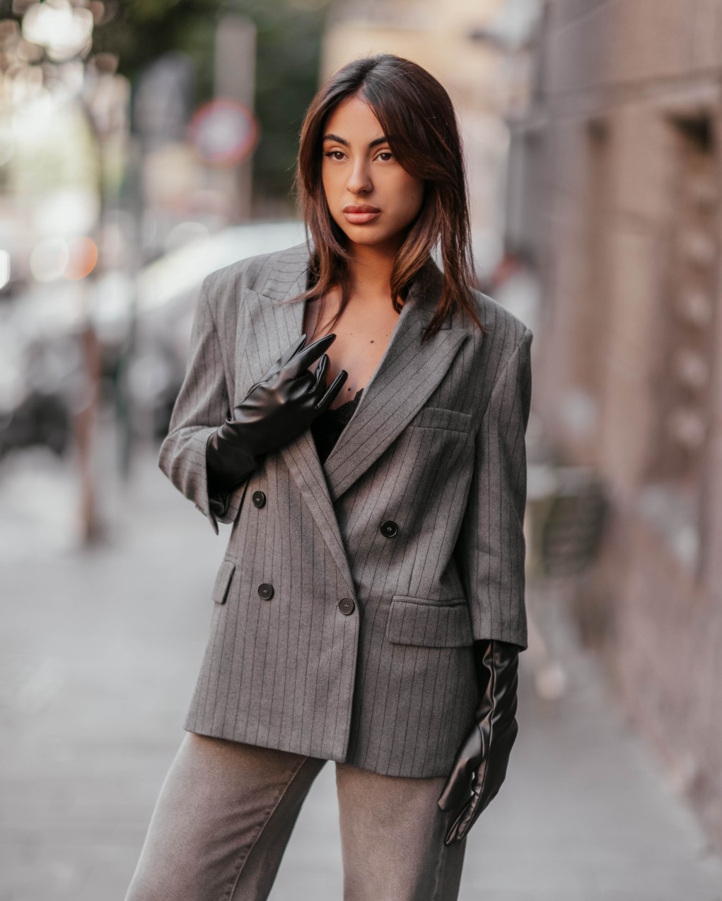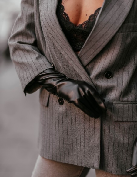 Giacca doppiopetto gessata con guanti lunghi in ecopelle integrati e spalline imbottite. Foderata internamente, con tasche frontali, spacchetto posteriore e maniche 3/4. Linea sofisticata e originale per un look distintivo.