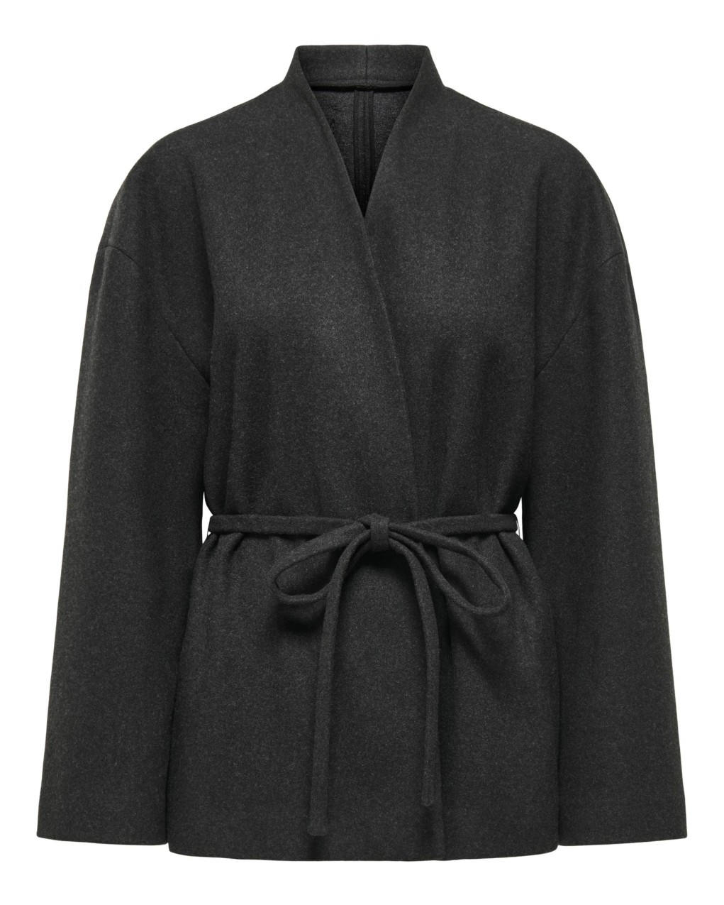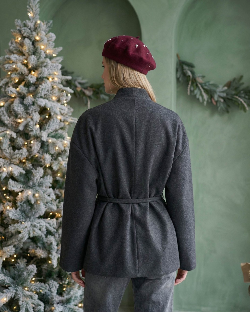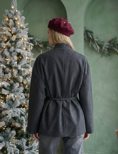 Elegante giacca vestaglia in morbido tessuto effetto lana, perfetta per un look casual-chic. Presenta scollo a V incrociato, maniche lunghe e cintura in vita per una vestibilità regolabile e confortevole. Il design avvolgente e la texture calda garantiscono comfort e stile durante la stagione fredda. Vestibilità regular, ideale da indossare sopra abbigliamento casual per momenti di relax raffinati.