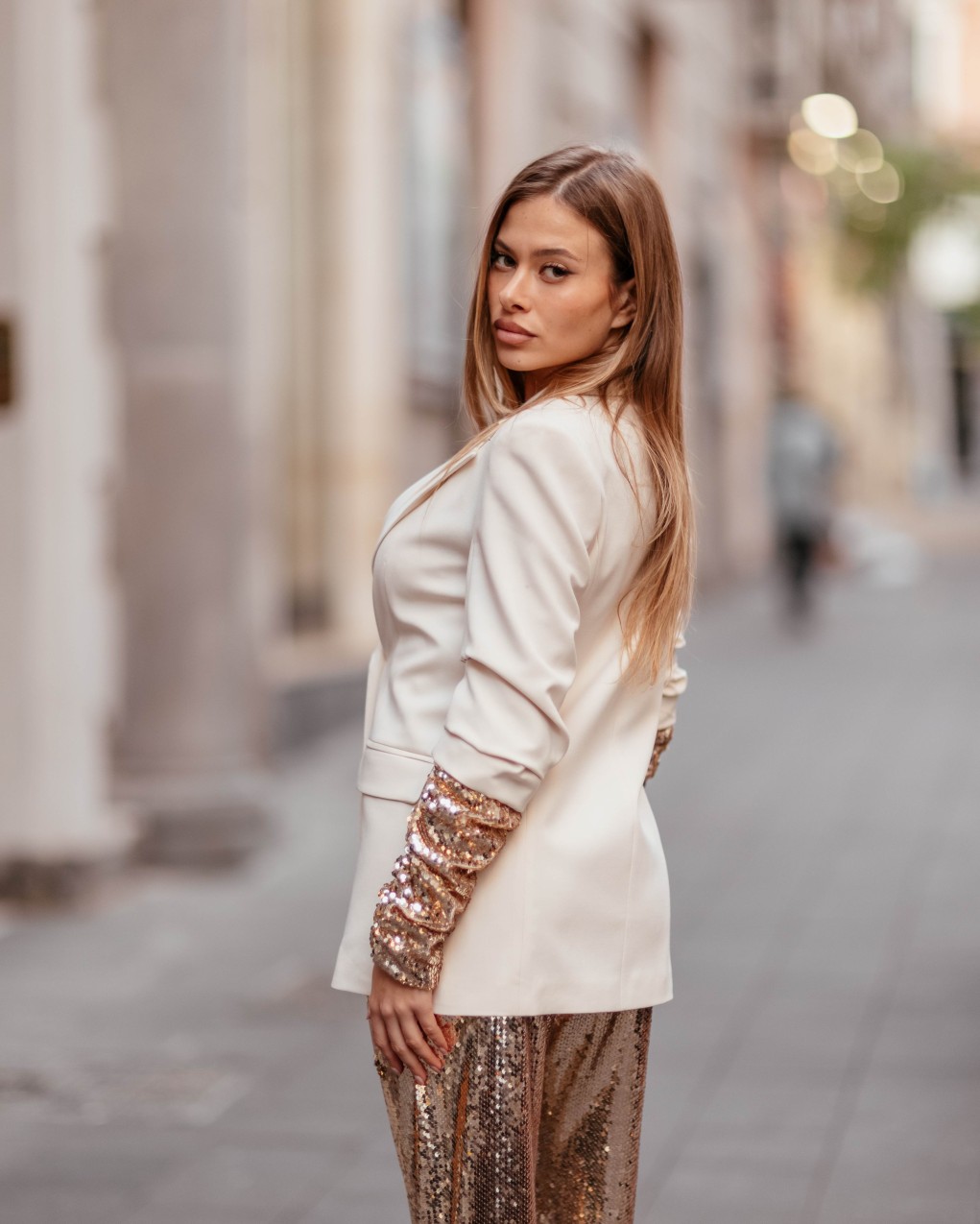 Blazer da donna elegante con dettagli glamour in paillettes sulle maniche. Il design presenta un taglio sartoriale strutturato con revers classici, tasche frontali e chiusura con bottoni. Realizzato in tessuto di qualità premium con applicazioni scintillanti che aggiungono un tocco sofisticato e festivo. La vestibilità è regolare con linea aderente che valorizza la silhouette, perfetto per occasioni speciali ed eventi serali.