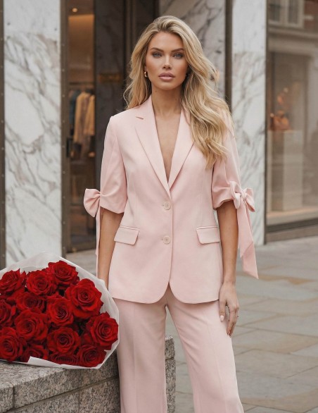 Completo giacca dallo stile contemporaneo e sofisticato, perfetto per occasioni formali ed eventi eleganti. La giacca presenta maniche a tre quarti con dettaglio a fiocco, revers classici, chiusura a due bottoni e tasche applicate frontali. Realizzato in tessuto di qualità con una texture liscia e strutturata, garantisce un fit regolare e una silhouette femminile impeccabile.