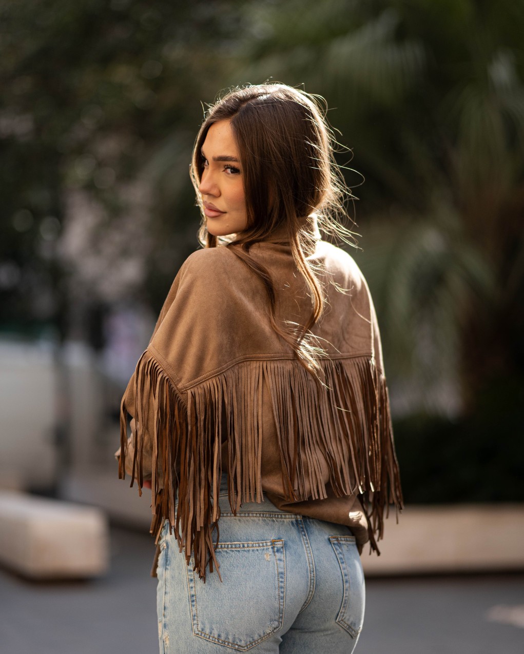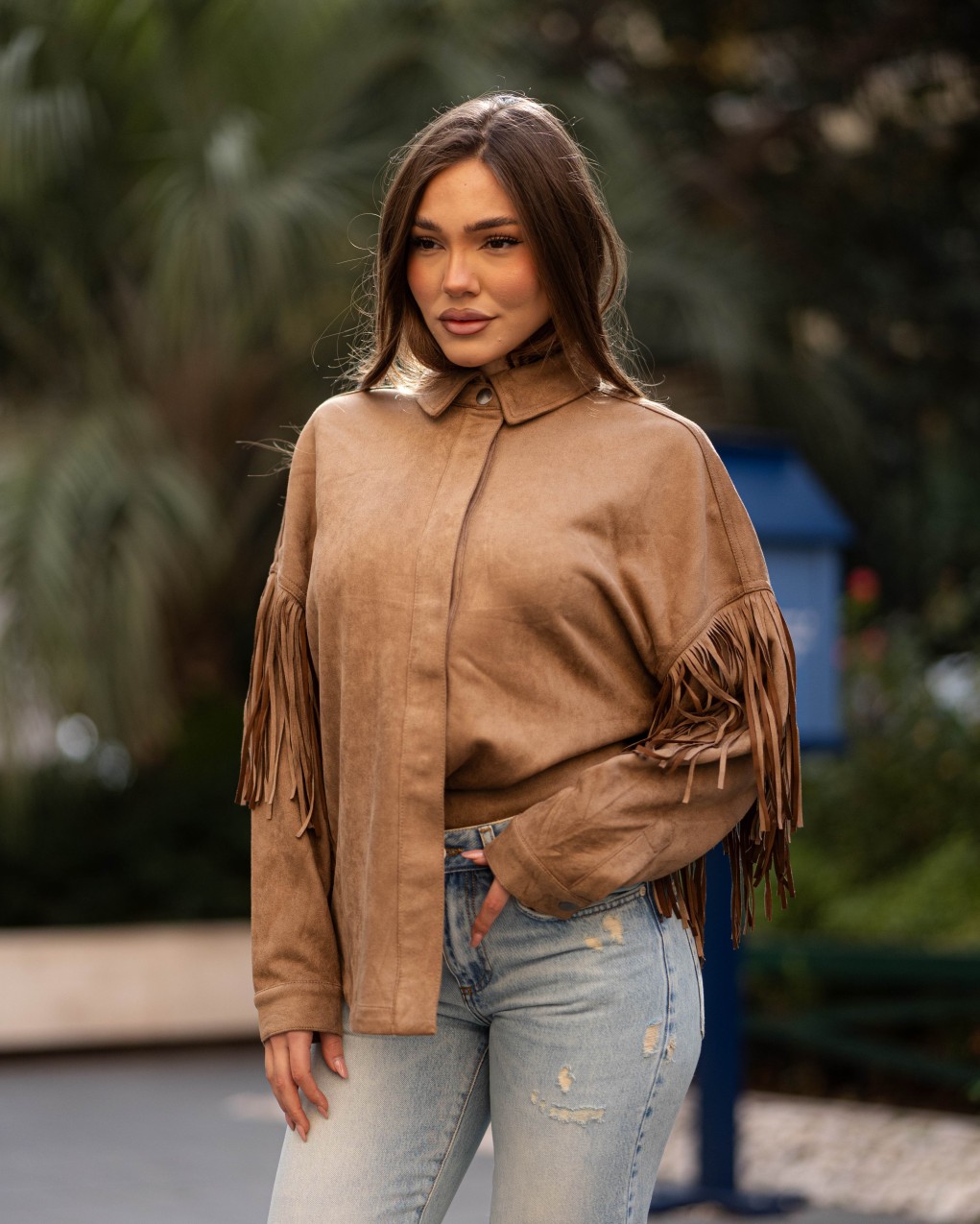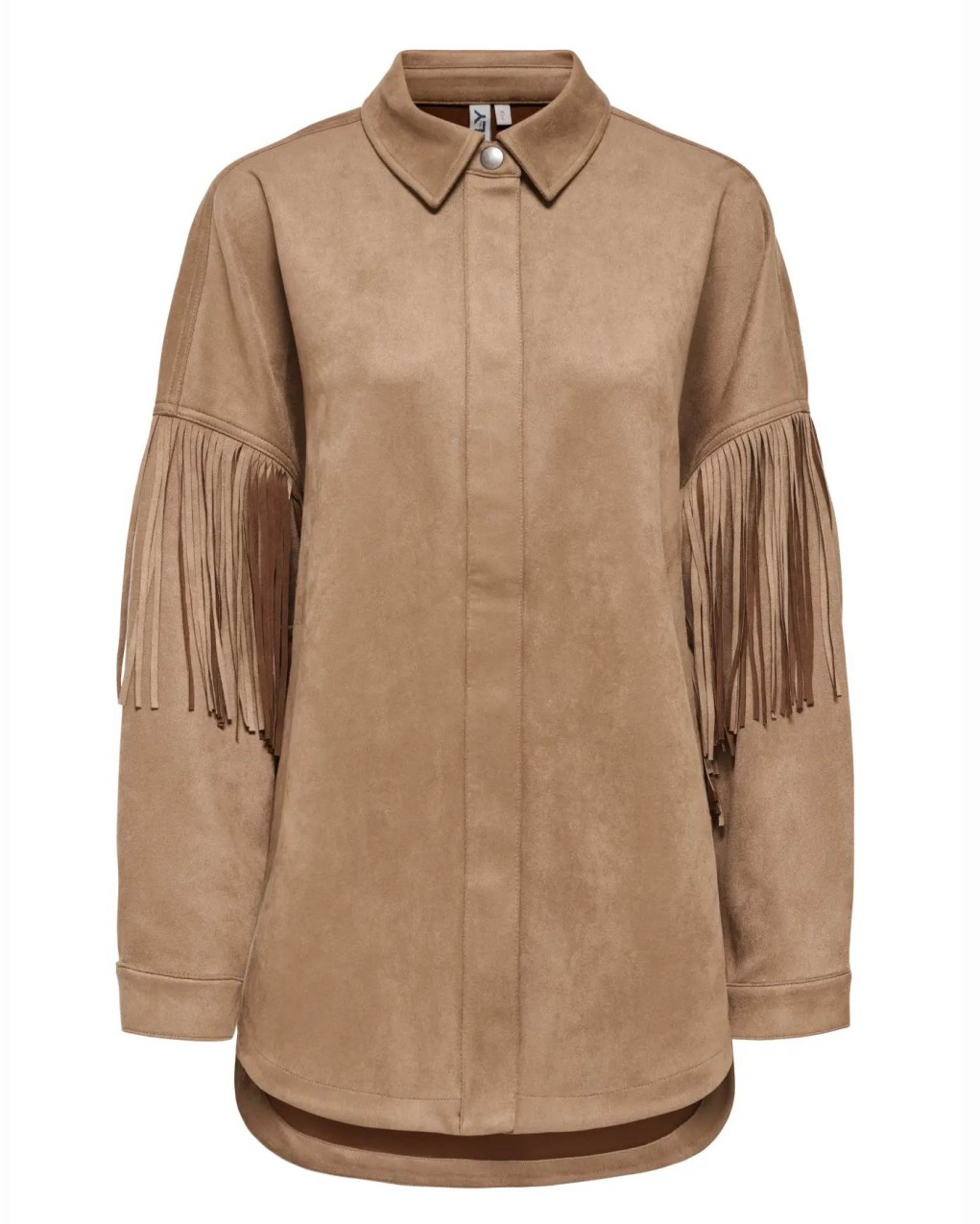 Camicia in suede sintetico dallo stile western contemporaneo, caratterizzata da eleganti frange applicate sulle maniche che conferiscono movimento e personalità al capo. Realizzata in morbido materiale effetto scamosciato, presenta colletto classico e chiusura frontale a bottoni nascosti. La vestibilità è regolare e comoda, perfetta da abbinare sia a jeans che a pantaloni eleganti per un look ricercato e di tendenza.