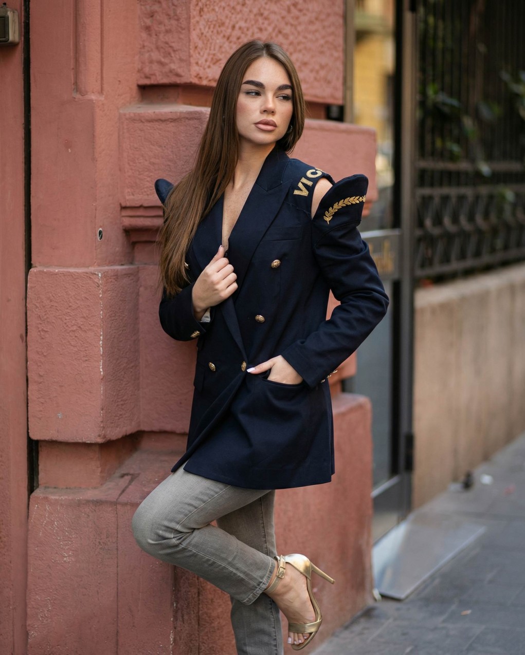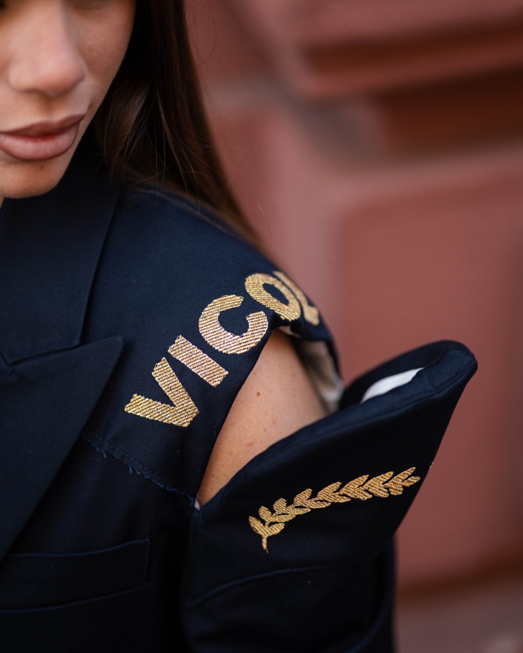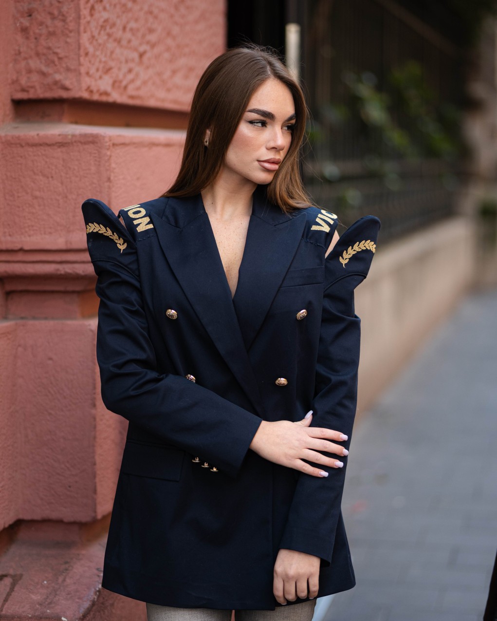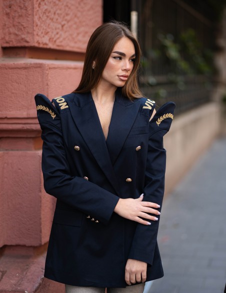 Blazer doppiopetto da donna dallo stile militare contemporaneo, caratterizzato da dettagli distintivi sulle spalline e ricami decorativi sulle maniche. Realizzato in tessuto strutturato di qualità, presenta bottoni metallici decorativi e revers classici per un look sofisticato e deciso. La vestibilità è regolare con linea leggermente oversize, ideale per outfit formali ed eleganti da giorno. Perfetto per completare look con un tocco di carattere.