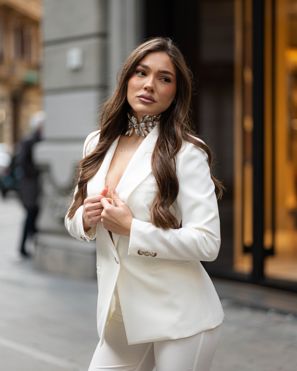 Giacca da donna dal taglio sartoriale e dalla vestibilità regolare, caratterizzata da una linea essenziale e raffinata. Il modello presenta rever classico, chiusura frontale con un bottone effetto marmorizzato e tasche a filetto che mantengono il design pulito e minimal. Le maniche lunghe sono rifinite da bottoni al fondo, mentre il retro è completato da uno spacco centrale che assicura comfort e libertà di movimento. Un capo versatile e senza tempo, perfetto per look formali o per abbinamenti più moderni e femminili