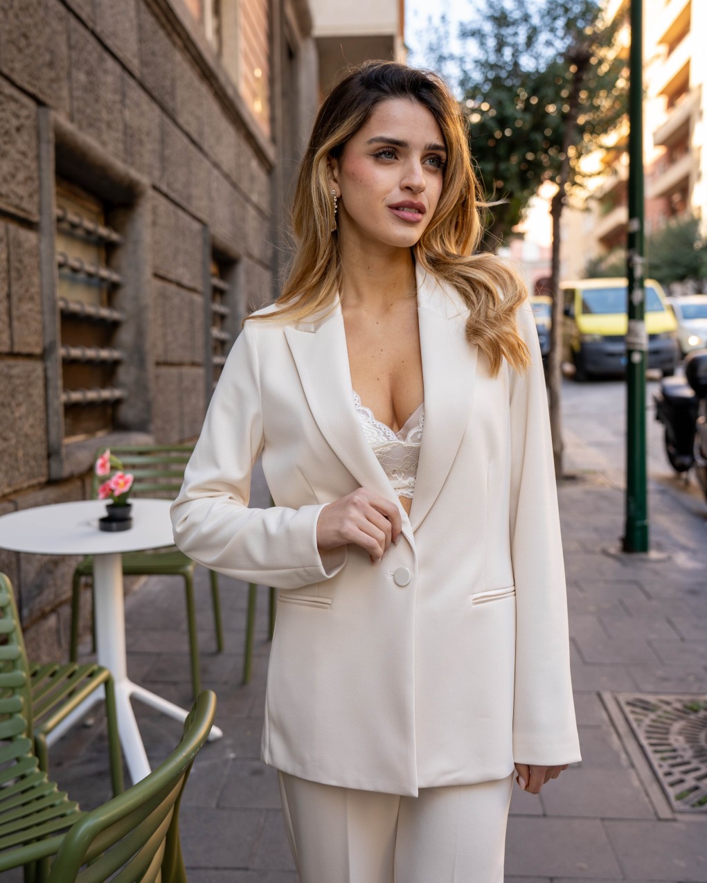 Giacca monopetto da donna dal taglio sartoriale ed elegante. Presenta rever classici, chiusura monopetto con un bottone e tasche a filetto che ne sottolineano lo stile pulito e raffinato. La linea leggermente avvitata valorizza la silhouette senza costringere, mentre le maniche lunghe e la lunghezza ai fianchi la rendono estremamente versatile. Perfetta da indossare sia come completo coordinato sia spezzata, è una giacca ideale per look professionali, cerimonia o outfit chic da giorno