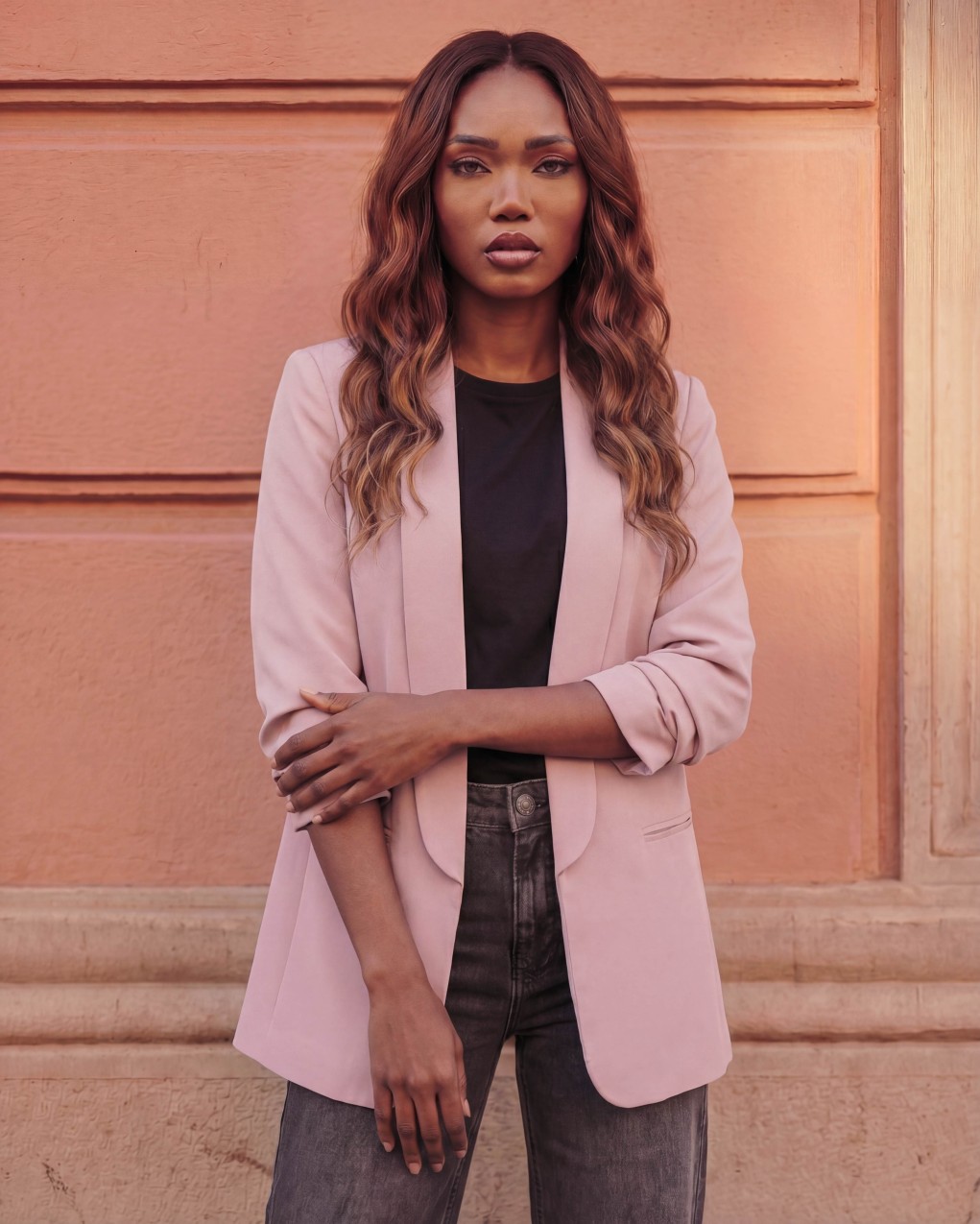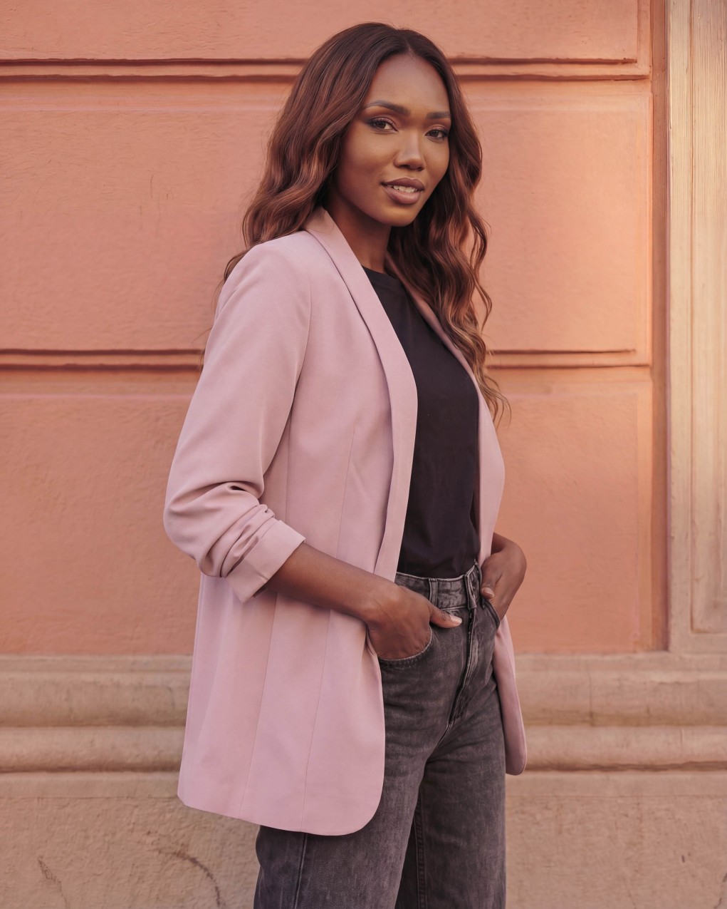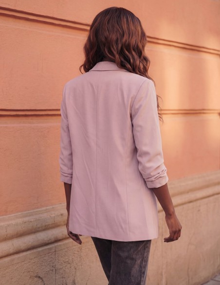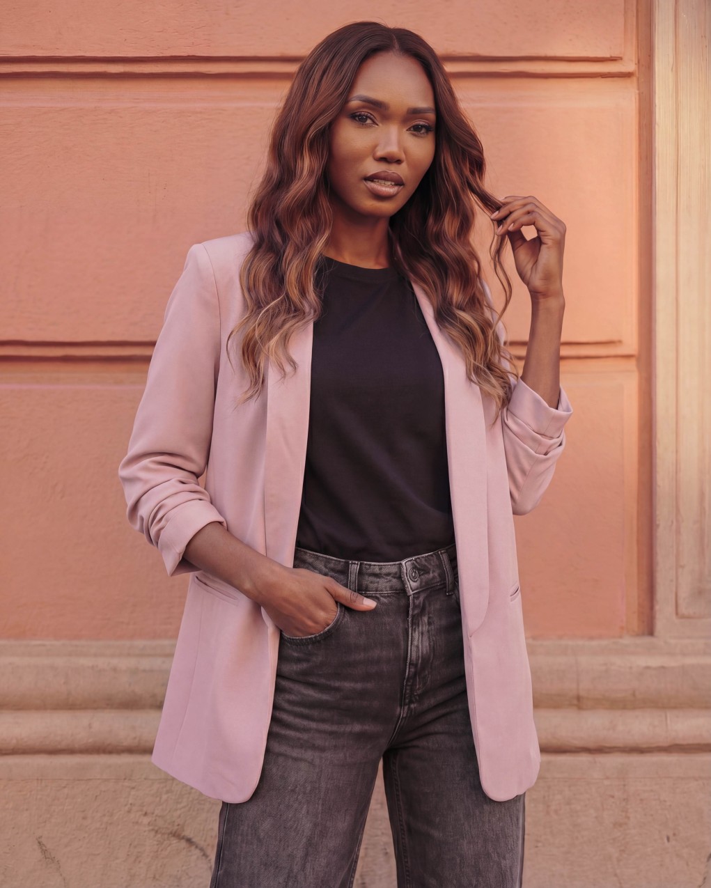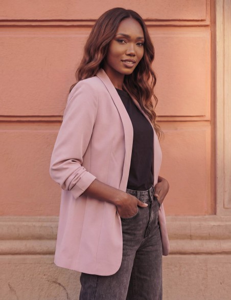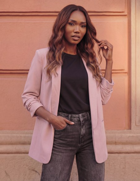 Blazer dal taglio sartoriale con linea lunga e strutturata, perfetto per look professionali ed eleganti. Realizzato in tessuto di qualità, aperta sul davanti, presenta maniche a tre quarti leggermente arrotolate che conferiscono un tocco moderno e informale. Il design oversize garantisce una vestibilità comoda e rilassata, mentre la lunghezza estesa allunga la silhouette. Ideale per l'ufficio o occasioni business casual, si abbina perfettamente a pantaloni sia formali che denim.