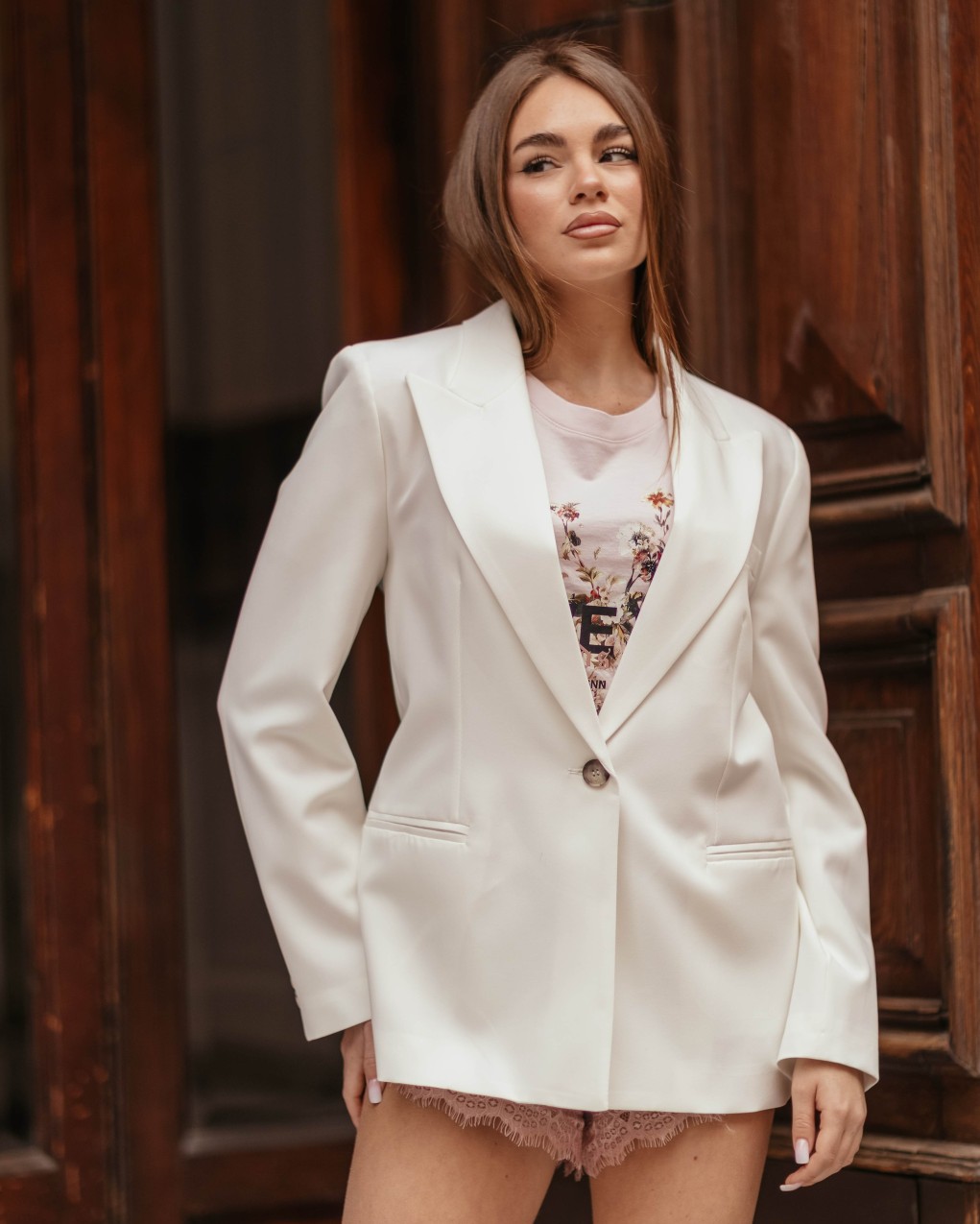 Giacca da donna dal taglio sartoriale e dalla vestibilità regolare, caratterizzata da una linea essenziale e raffinata. Il modello presenta rever classico, chiusura frontale con un bottone effetto marmorizzato e tasche a filetto che mantengono il design pulito e minimal. Le maniche lunghe sono rifinite da bottoni al fondo, mentre il retro è completato da uno spacco centrale che assicura comfort e libertà di movimento. Un capo versatile e senza tempo, perfetto per look formali o per abbinamenti più moderni e femminili