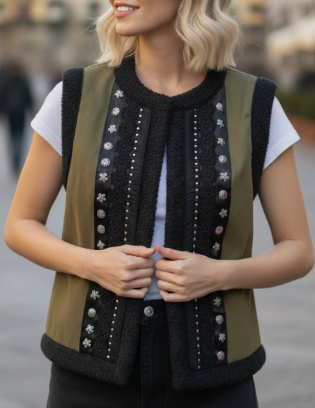 Gilet in cotone imbottito con bordi a contrasto e passamaneria, senza chiusura