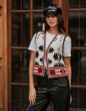 Gilet in maglia lavorato con motivo damascato, realizzato in morbida lana di alta qualità. Il capo presenta una vestibilità regolare con apertura frontale e bordi rifiniti, perfetto per essere stratificato su look casual o eleganti. La texture elaborata e il design senza maniche lo rendono un versatile pezzo statement per la tua collezione autunnale.