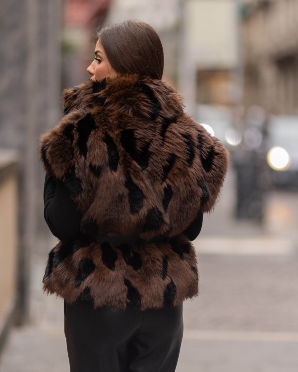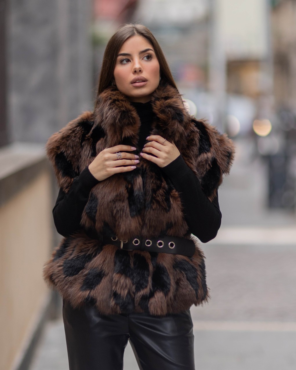 Gilet in pelliccia ecologica di lusso con elegante cintura in vita per una silhouette definita. Il capo presenta una lavorazione a pannelli che crea un sofisticato effetto texture, mentre il taglio senza maniche lo rende perfetto per look stratificati. La vestibilità versatile e la lunghezza media si adattano perfettamente a diverse corporature, ideale per completare outfit invernali con stile.