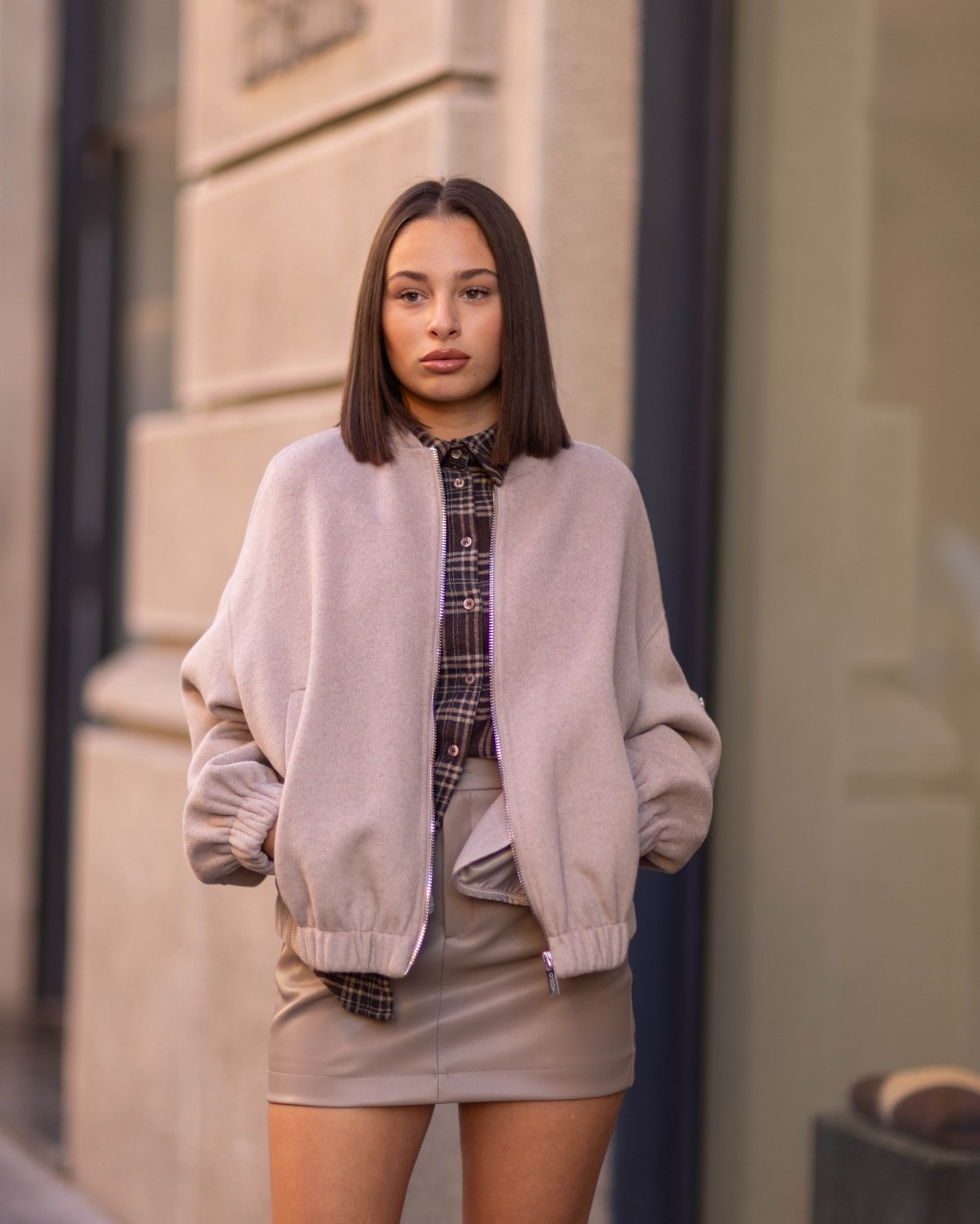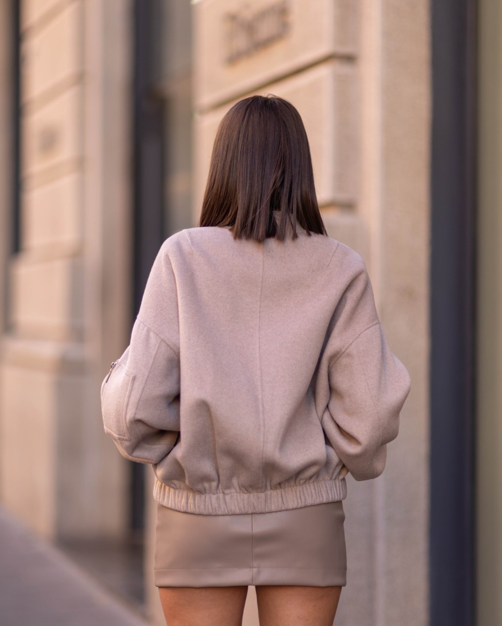 Elegante bomber in morbido tessuto con taglio oversize e design versatile. La silhouette rilassata presenta polsini e vita elasticizzati per una vestibilità confortevole, mentre le linee pulite si adattano perfettamente a look sia casual che ricercati. Realizzato in pregiato materiale che garantisce comfort e durabilità, questo capo rappresenta un essenziale nel guardaroba contemporaneo.