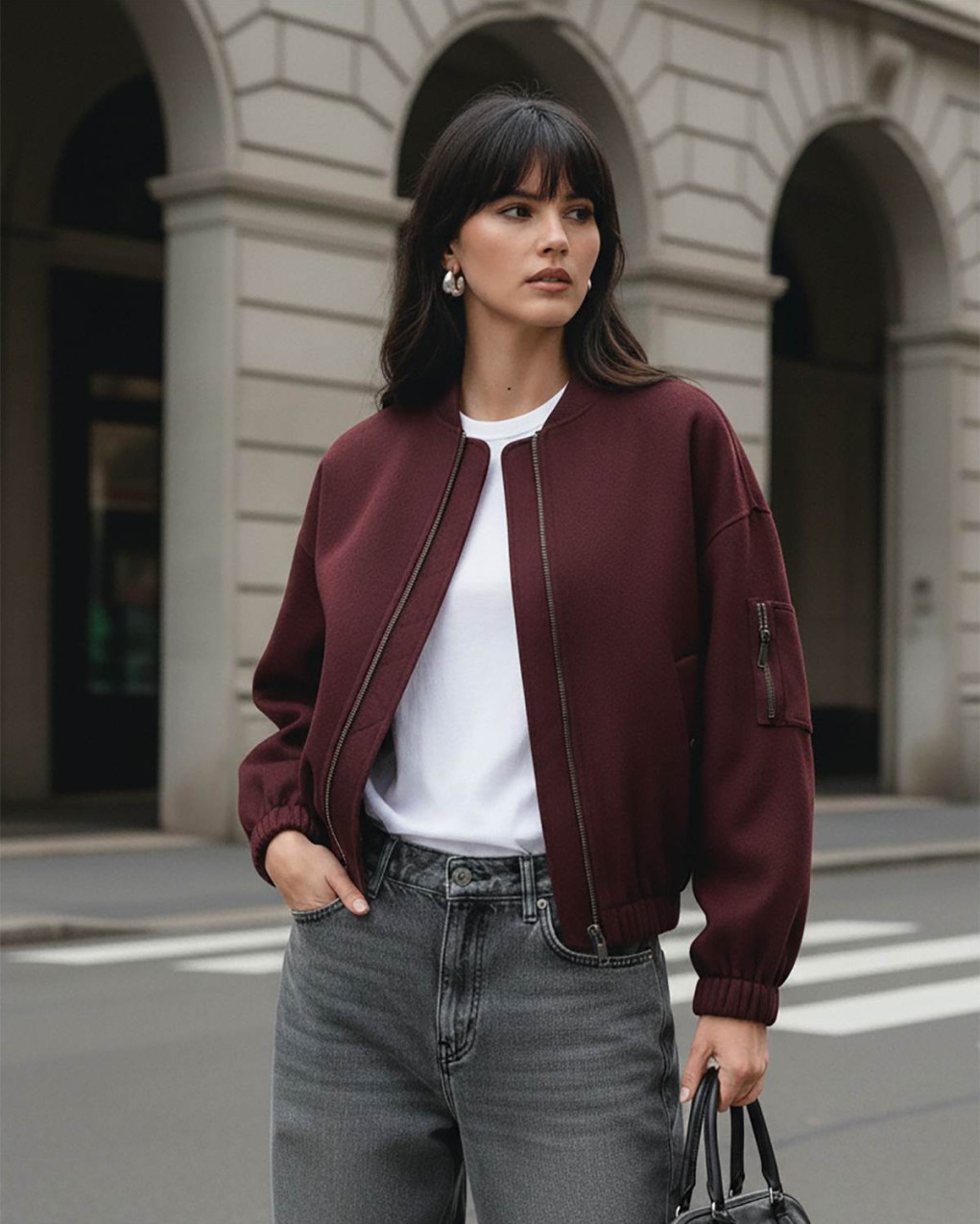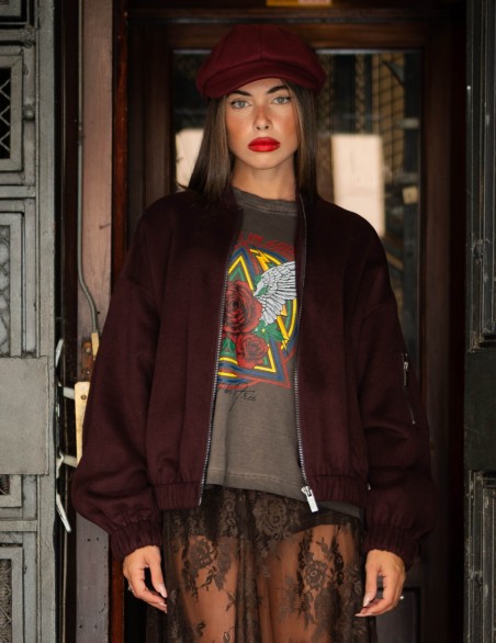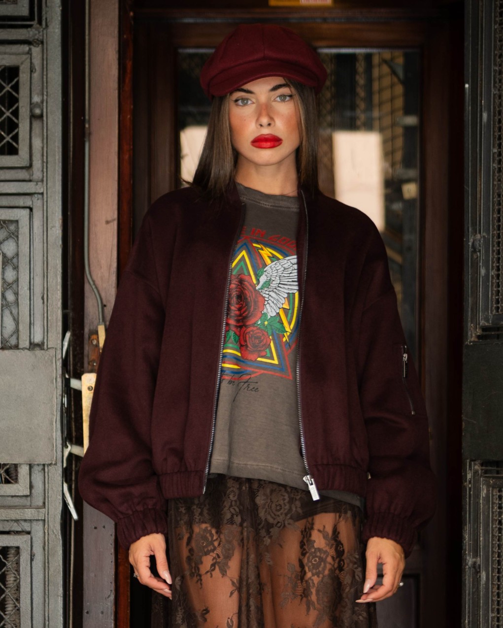 Elegante bomber in morbido tessuto con taglio oversize e design versatile. La silhouette rilassata presenta polsini e vita elasticizzati per una vestibilità confortevole, mentre le linee pulite si adattano perfettamente a look sia casual che ricercati. Realizzato in pregiato materiale che garantisce comfort e durabilità, questo capo rappresenta un essenziale nel guardaroba contemporaneo.