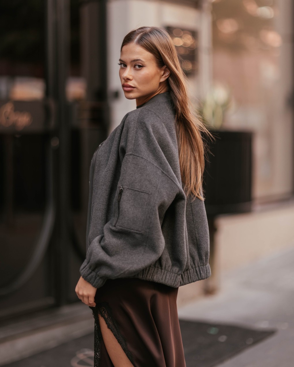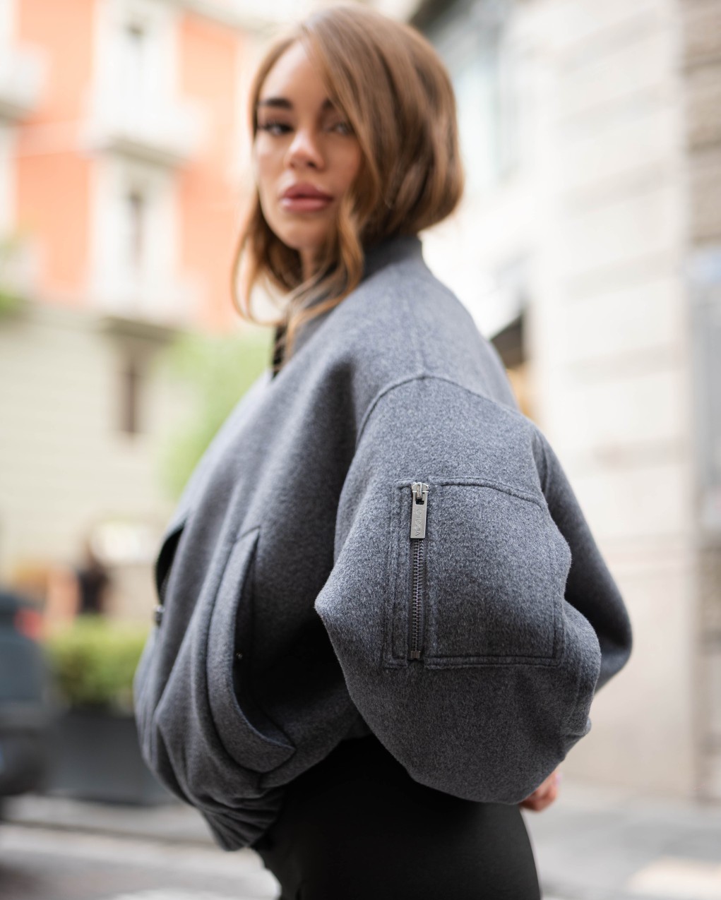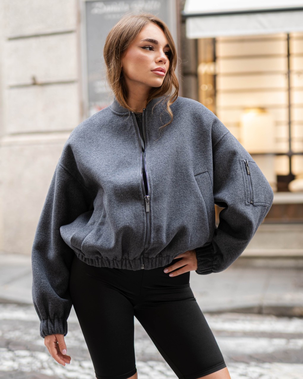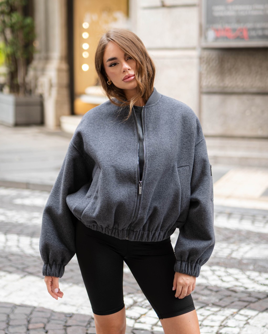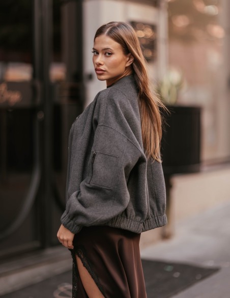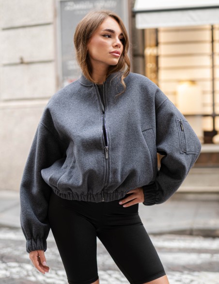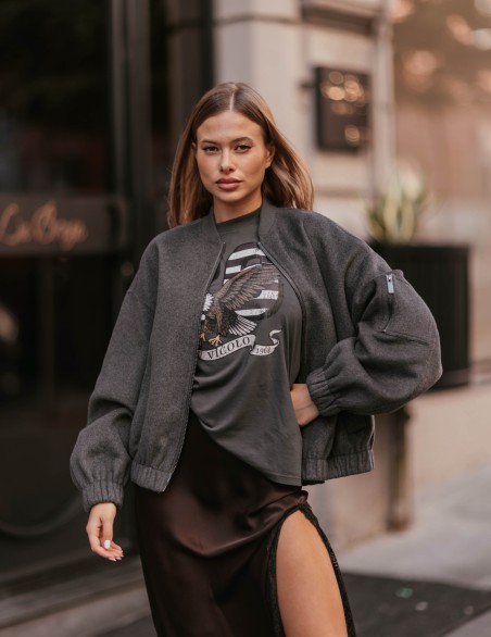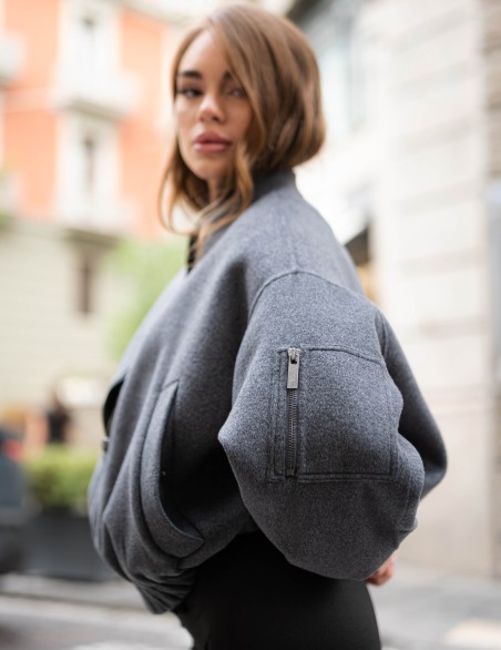 Elegante bomber in morbido tessuto con taglio oversize e design versatile. La silhouette rilassata presenta polsini e vita elasticizzati per una vestibilità confortevole, mentre le linee pulite si adattano perfettamente a look sia casual che ricercati. Realizzato in pregiato materiale che garantisce comfort e durabilità, questo capo rappresenta un essenziale nel guardaroba contemporaneo.