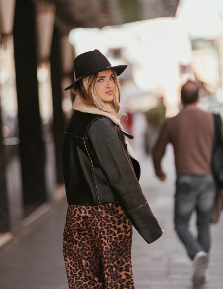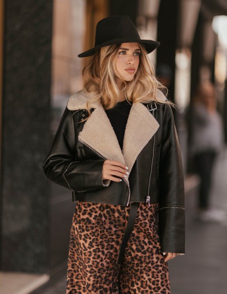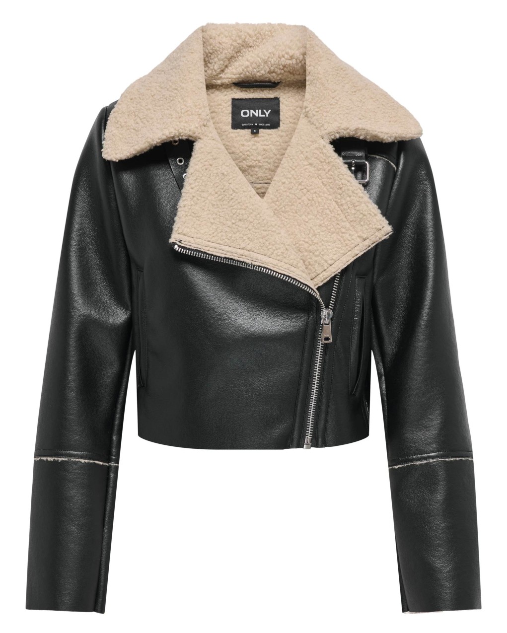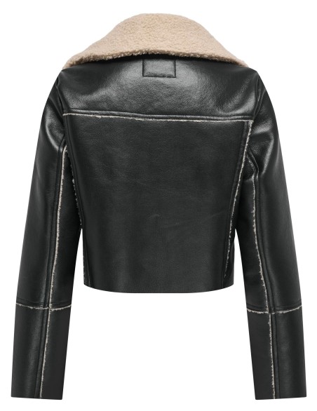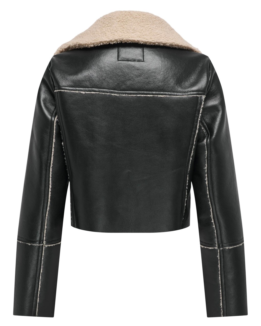 Giacca corta in ecopelle di alta qualità con colletto in morbida pelliccia sintetica e dettagli in shearling a contrasto. Design contemporaneo caratterizzato da cuciture decorative e taglio cropped per una silhouette moderna. La vestibilità aderente e la struttura del capo garantiscono comfort e stile per look casual-chic.