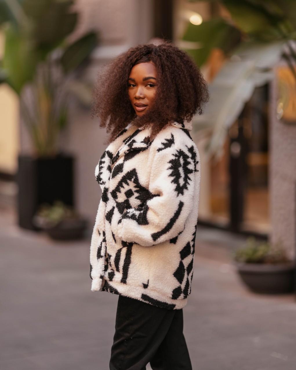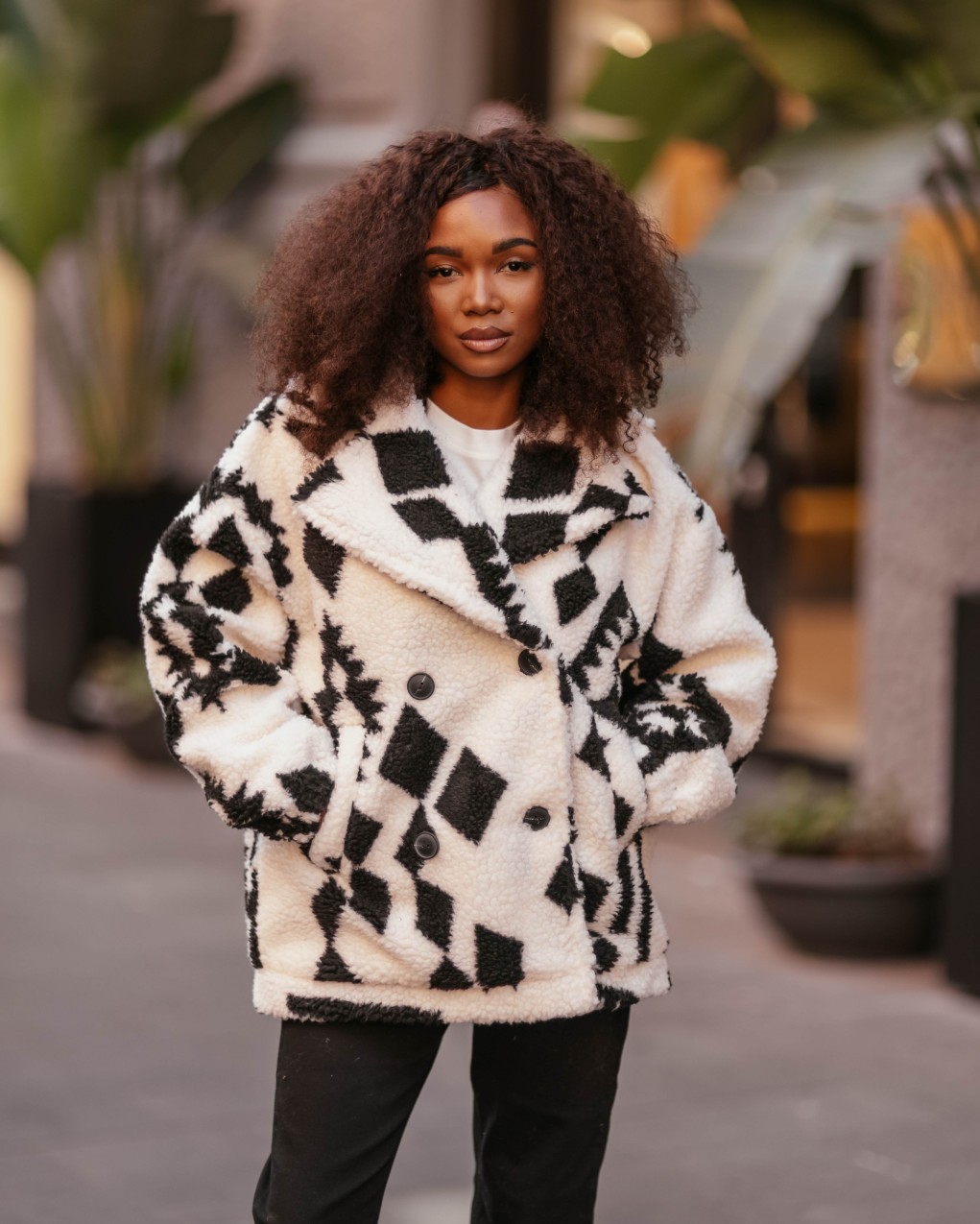 Realizzato in pelliccia sintetica morbida e calda, presenta un accattivante motivo geometrico in bianco e nero che lo rende unico e versatile