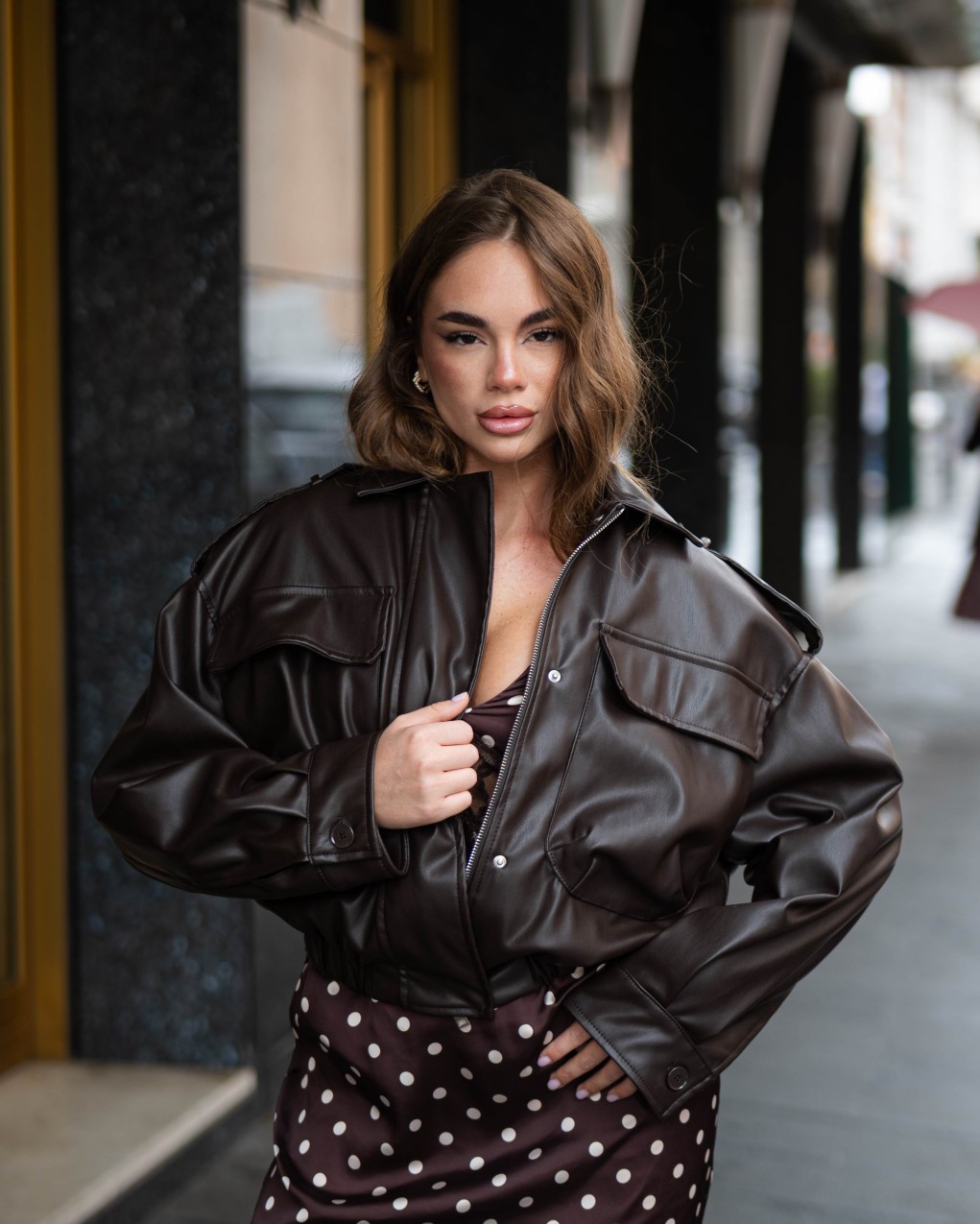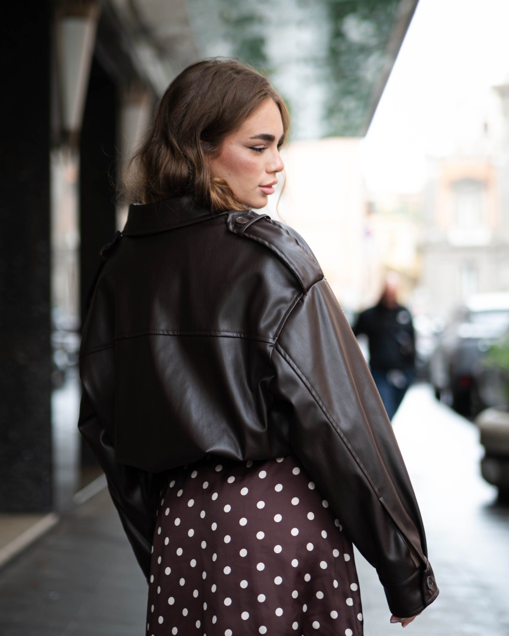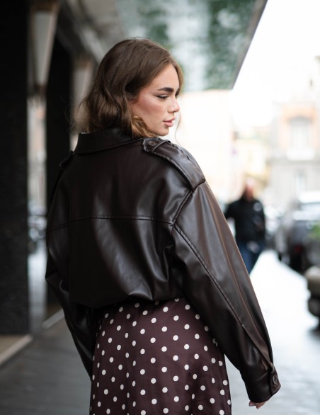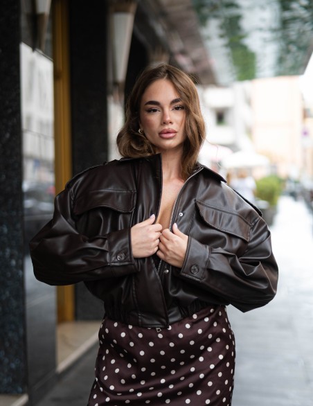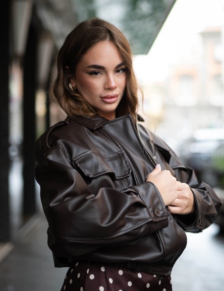 Giacca in ecopelle dal design oversize con silhouette cropped contemporanea. Caratterizzata da ampie tasche frontali con patta, chiusura con zip e dettagli bottoni a vista. La vestibilità ampia sulle spalle e maniche voluminose conferiscono un look distintivo e di tendenza, mentre il taglio corto in vita aggiunge un tocco femminile al capo.