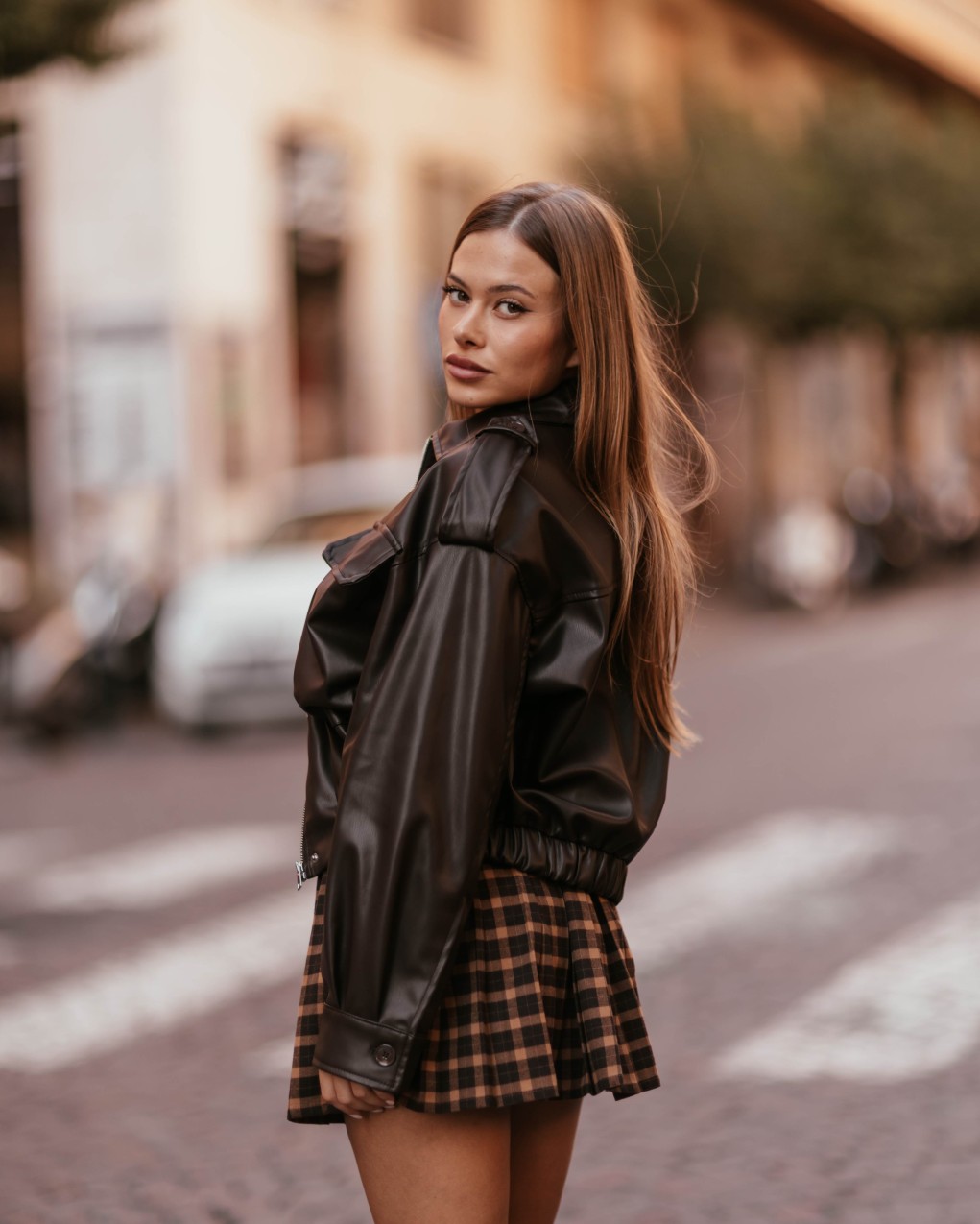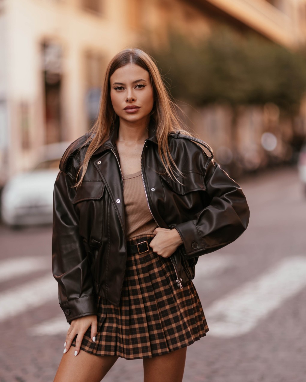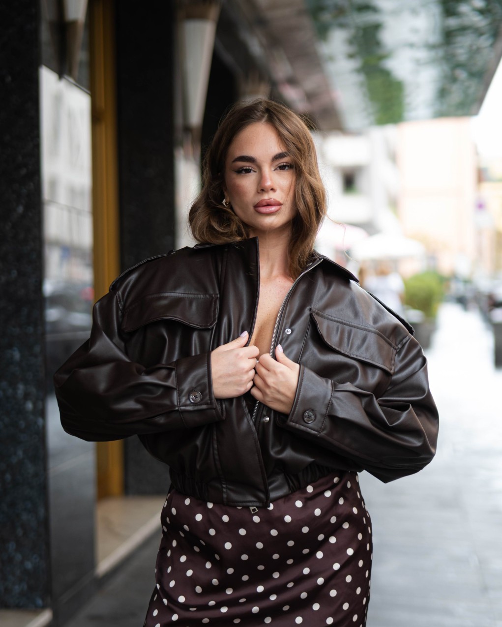 Giacca in ecopelle dal design oversize con silhouette cropped contemporanea. Caratterizzata da ampie tasche frontali con patta, chiusura con zip e dettagli bottoni a vista. La vestibilità ampia sulle spalle e maniche voluminose conferiscono un look distintivo e di tendenza, mentre il taglio corto in vita aggiunge un tocco femminile al capo.