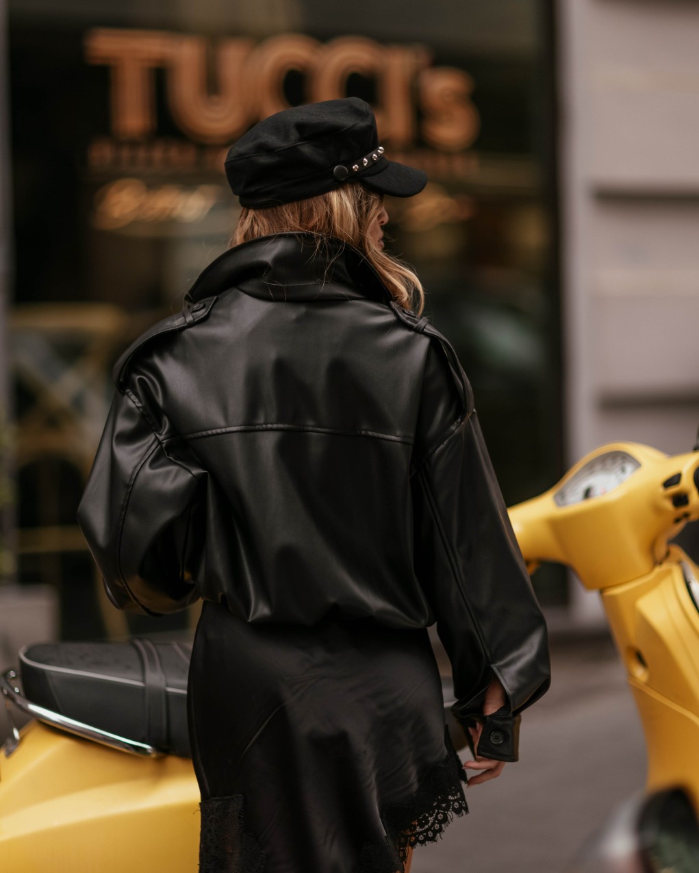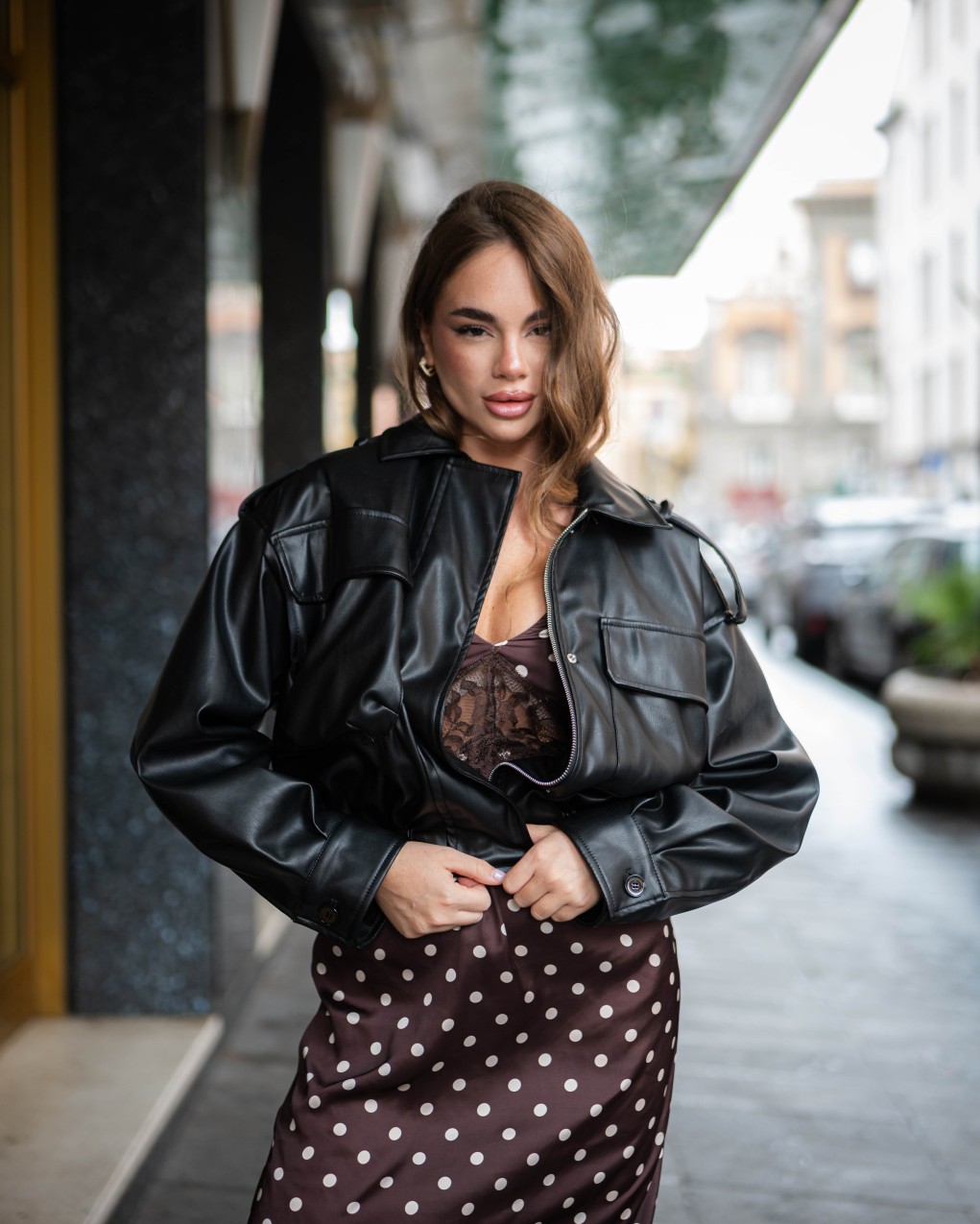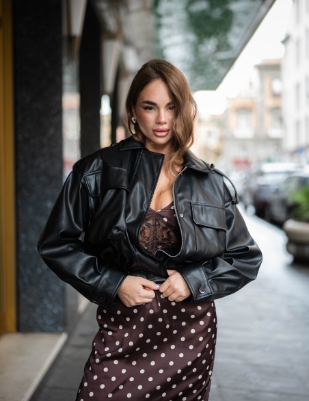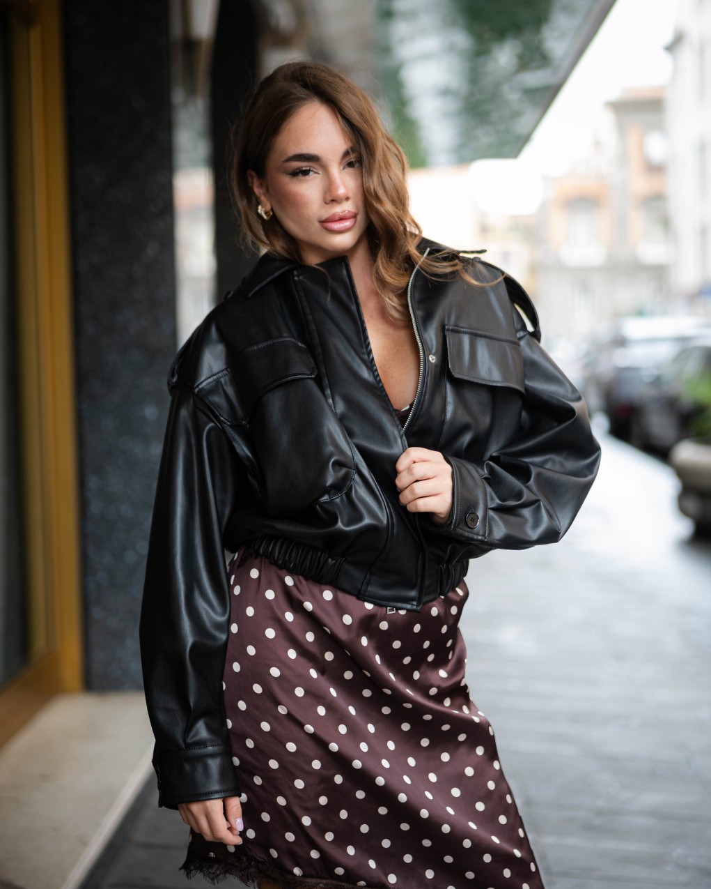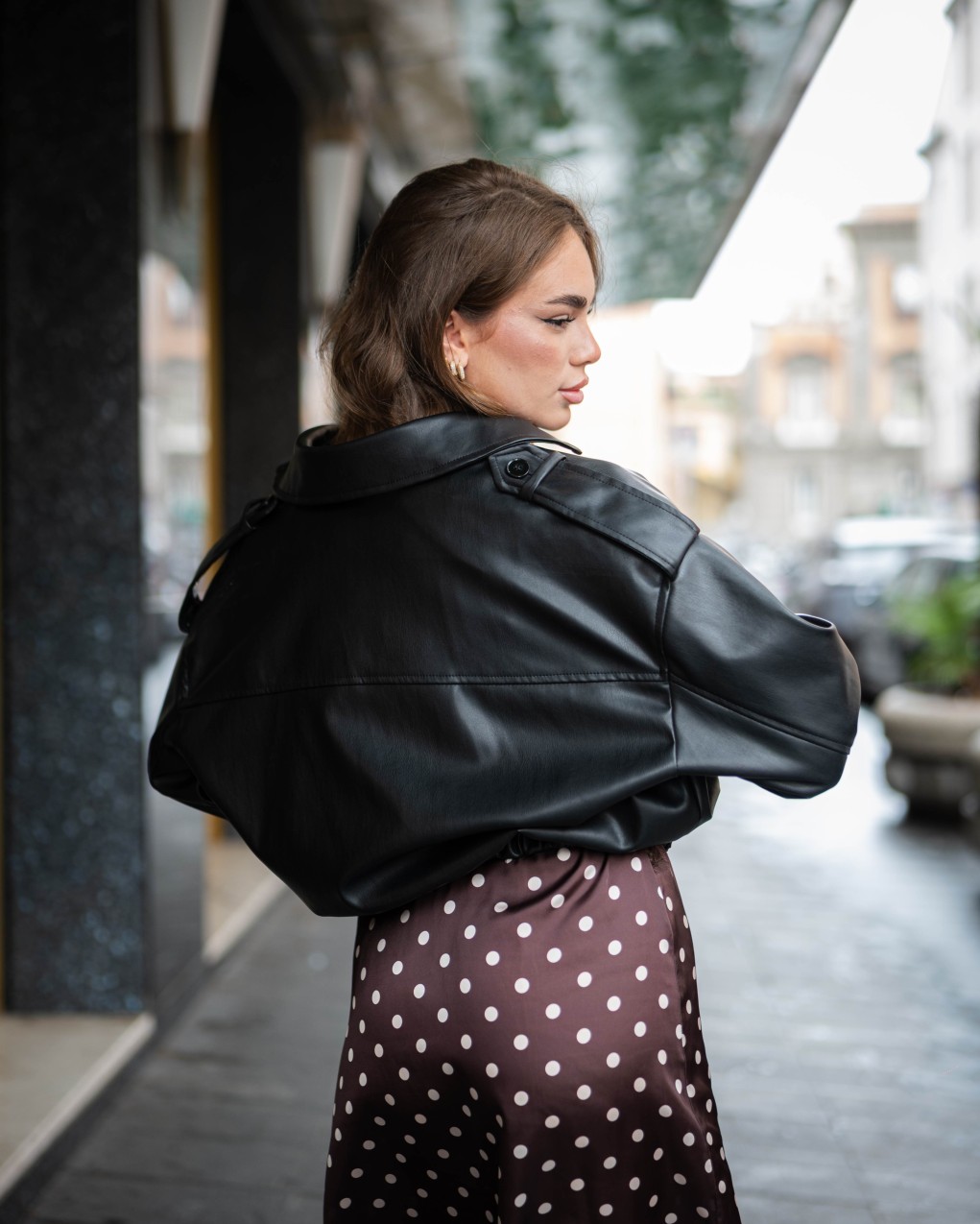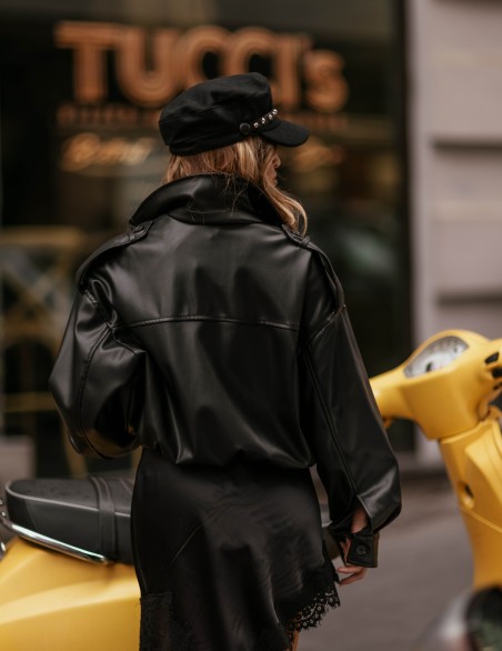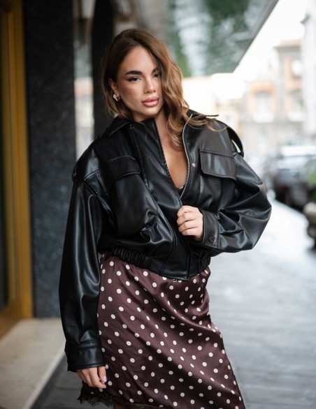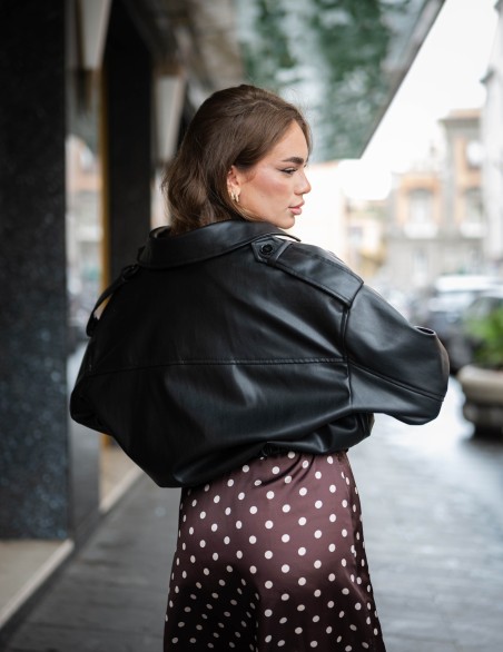 Giacca in ecopelle dal design oversize con silhouette cropped contemporanea. Caratterizzata da ampie tasche frontali con patta, chiusura con zip e dettagli bottoni a vista. La vestibilità ampia sulle spalle e maniche voluminose conferiscono un look distintivo e di tendenza, mentre il taglio corto in vita aggiunge un tocco femminile al capo.