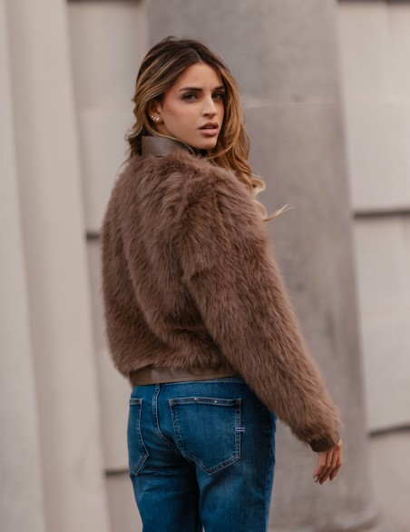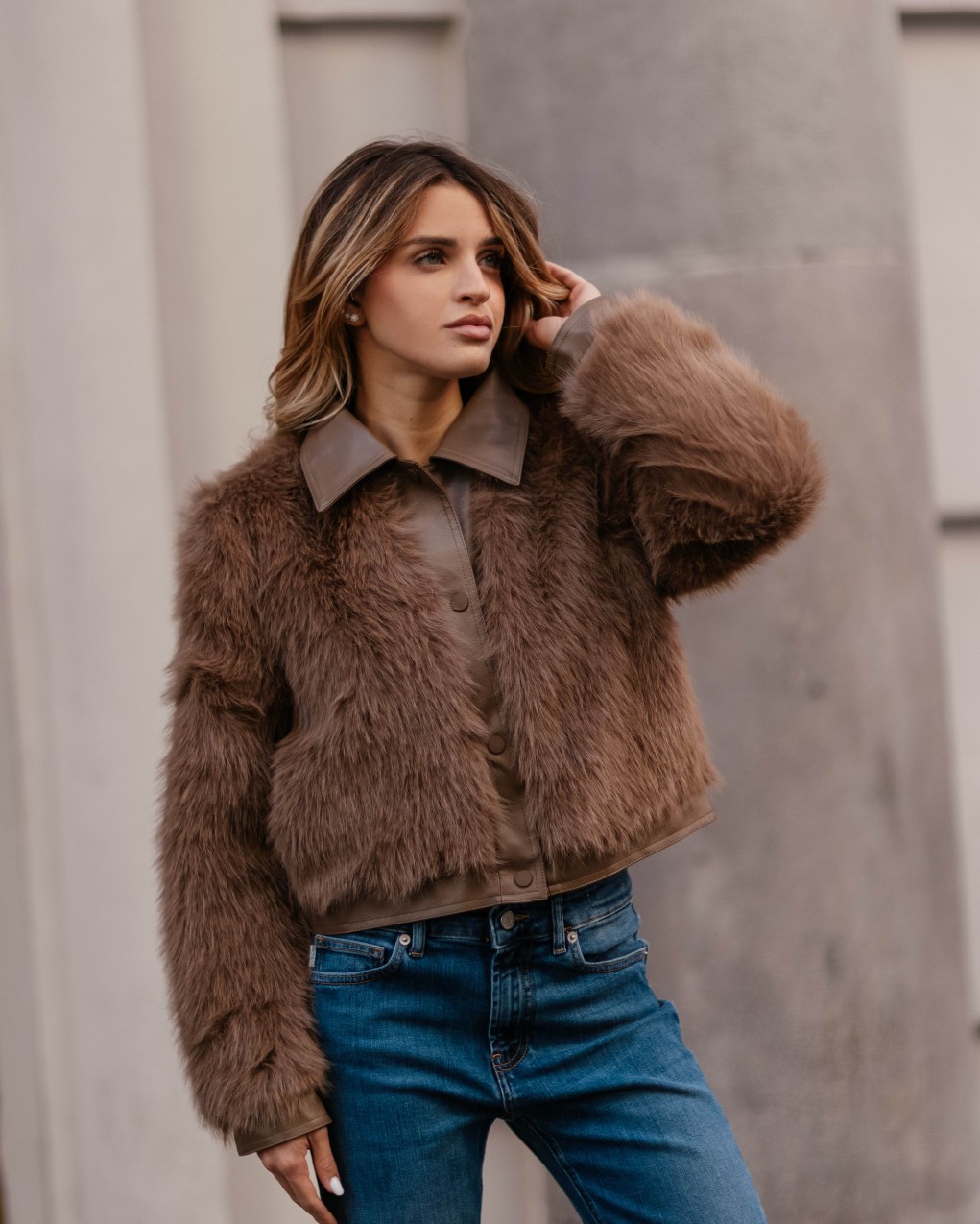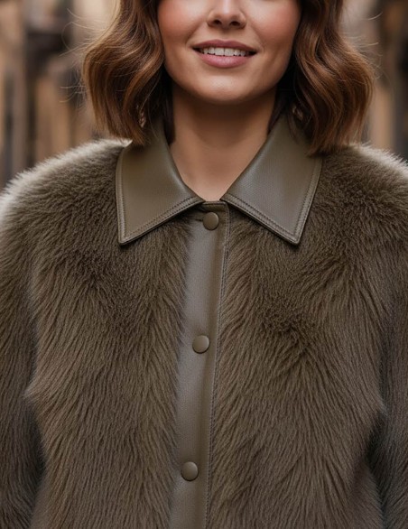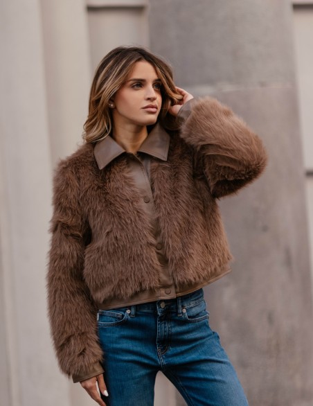 Giacca corta in eco-pelliccia con dettagli in similpelle, caratterizzata da un design contemporaneo che combina texture morbida e finiture raffinate. Il capo presenta una vestibilità regular con chiusura frontale a bottoni automatici e classico colletto camicia. Realizzata con materiali premium di alta qualità, questa giacca versatile si adatta perfettamente a look casual-chic e outfit urban.