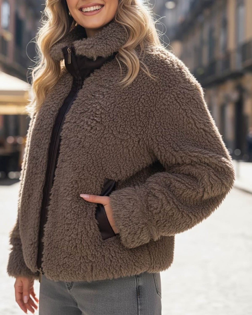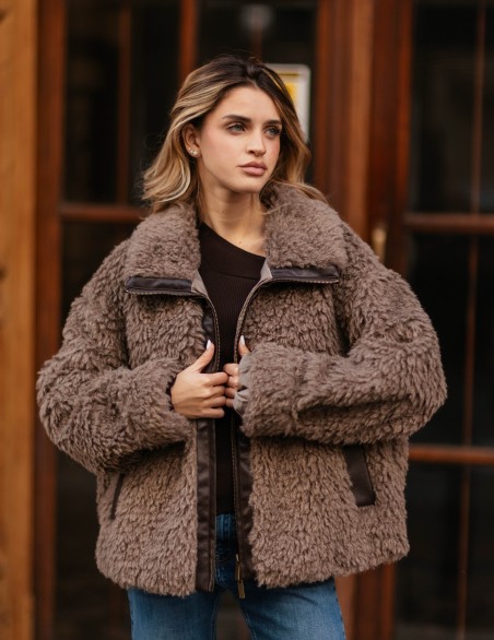 Giacca teddy in morbido tessuto effetto peluche, caratterizzata da una comoda zip frontale e tasche laterali. Il design oversized offre massimo comfort e calore durante la stagione fredda, mentre i polsini e il colletto elasticizzati garantiscono una perfetta vestibilità. Realizzata in soffice pelliccia sintetica di alta qualità, questa giacca rappresenta il perfetto connubio tra stile casual e praticità quotidiana.