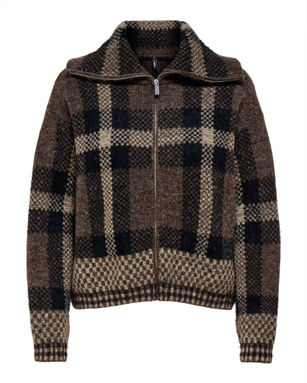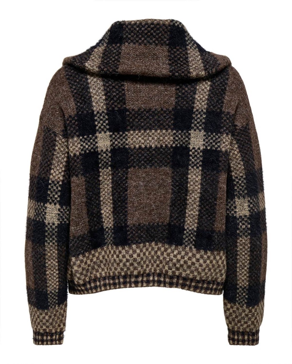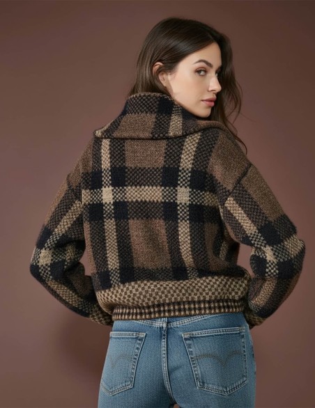 Giubbotto in morbido tessuto effetto lana con motivo a quadri oversize, dotato di pratica zip a mezzo collo. Il taglio comodo e la silhouette oversize lo rendono perfetto per uno stile casual-chic contemporaneo. La texture spazzolata e il pattern classico si combinano in un capo versatile, ideale da abbinare sia a jeans che a gonne.