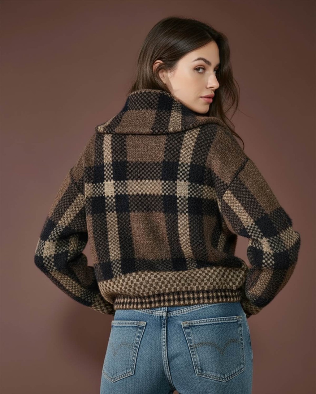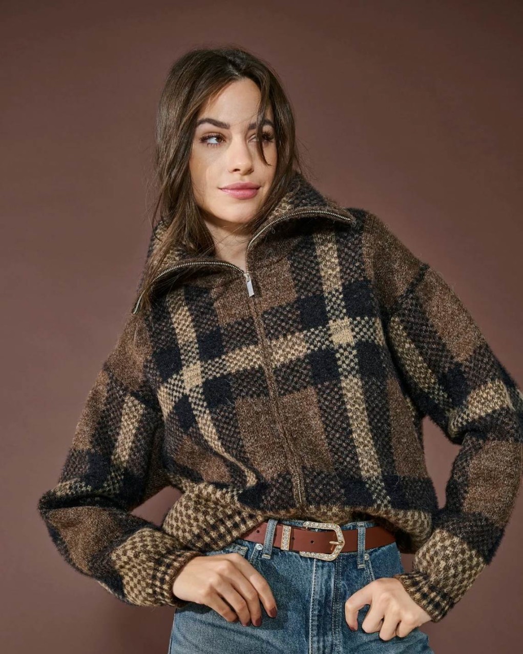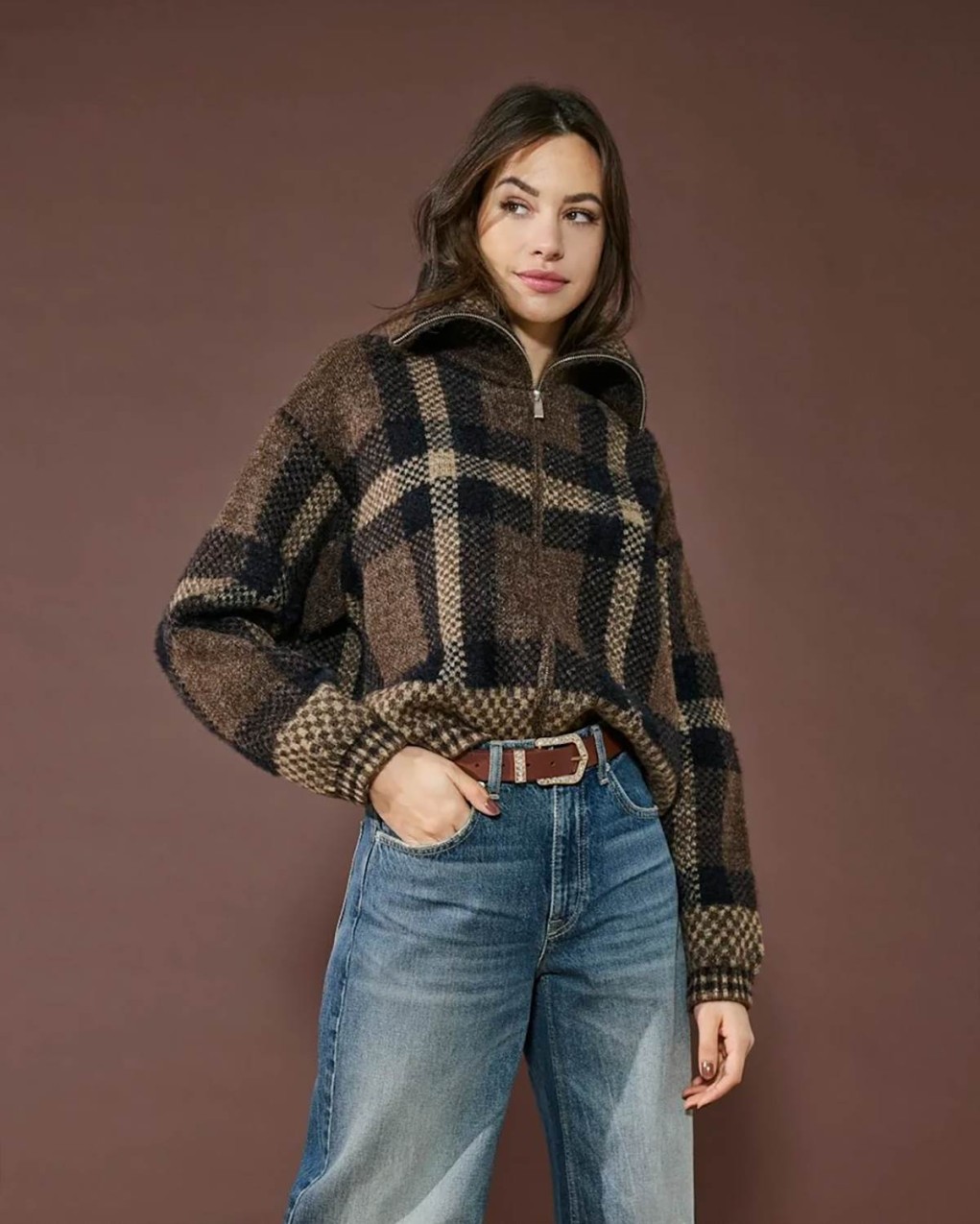 Giubbotto in morbido tessuto effetto lana con motivo a quadri oversize, dotato di pratica zip a mezzo collo. Il taglio comodo e la silhouette oversize lo rendono perfetto per uno stile casual-chic contemporaneo. La texture spazzolata e il pattern classico si combinano in un capo versatile, ideale da abbinare sia a jeans che a gonne.