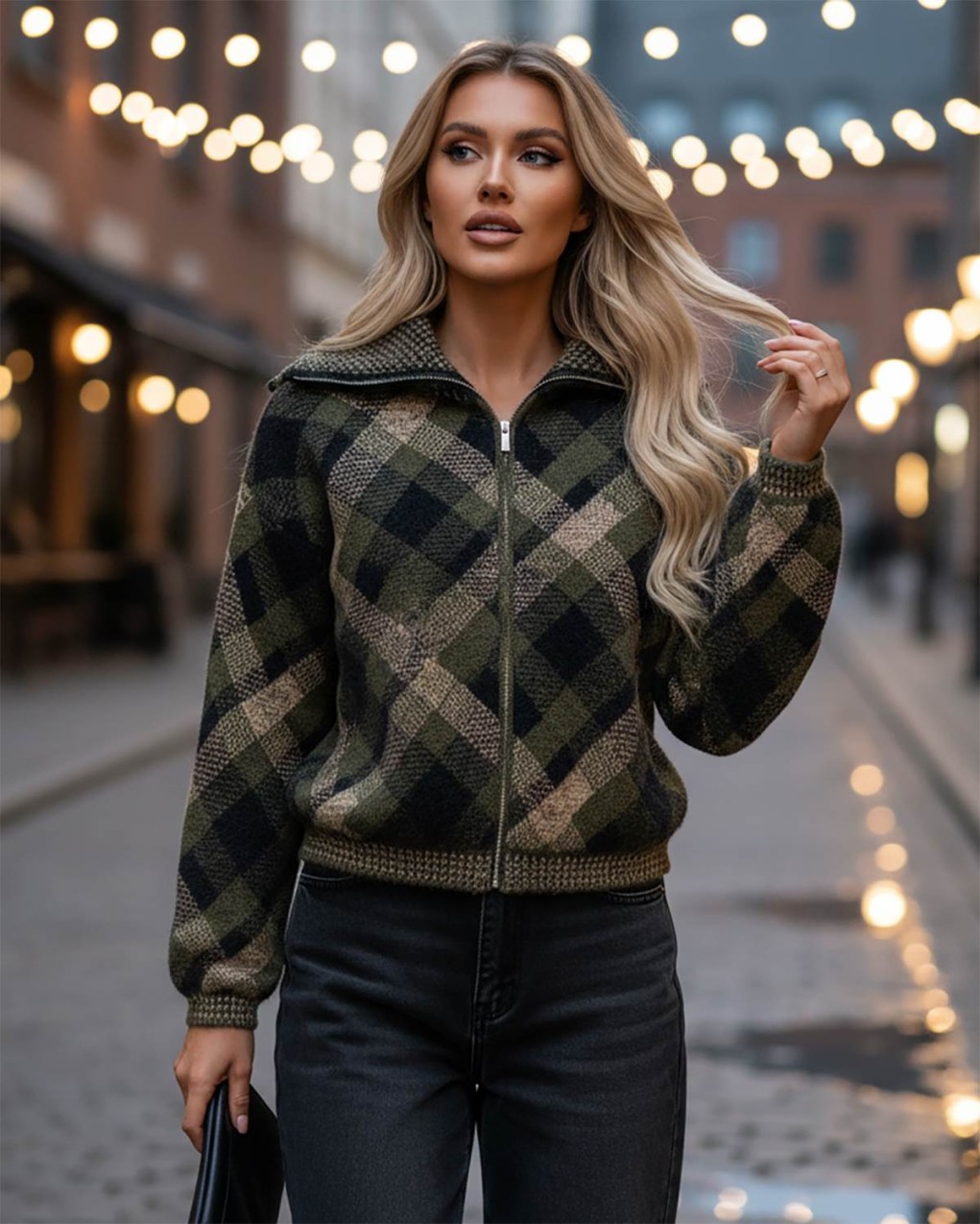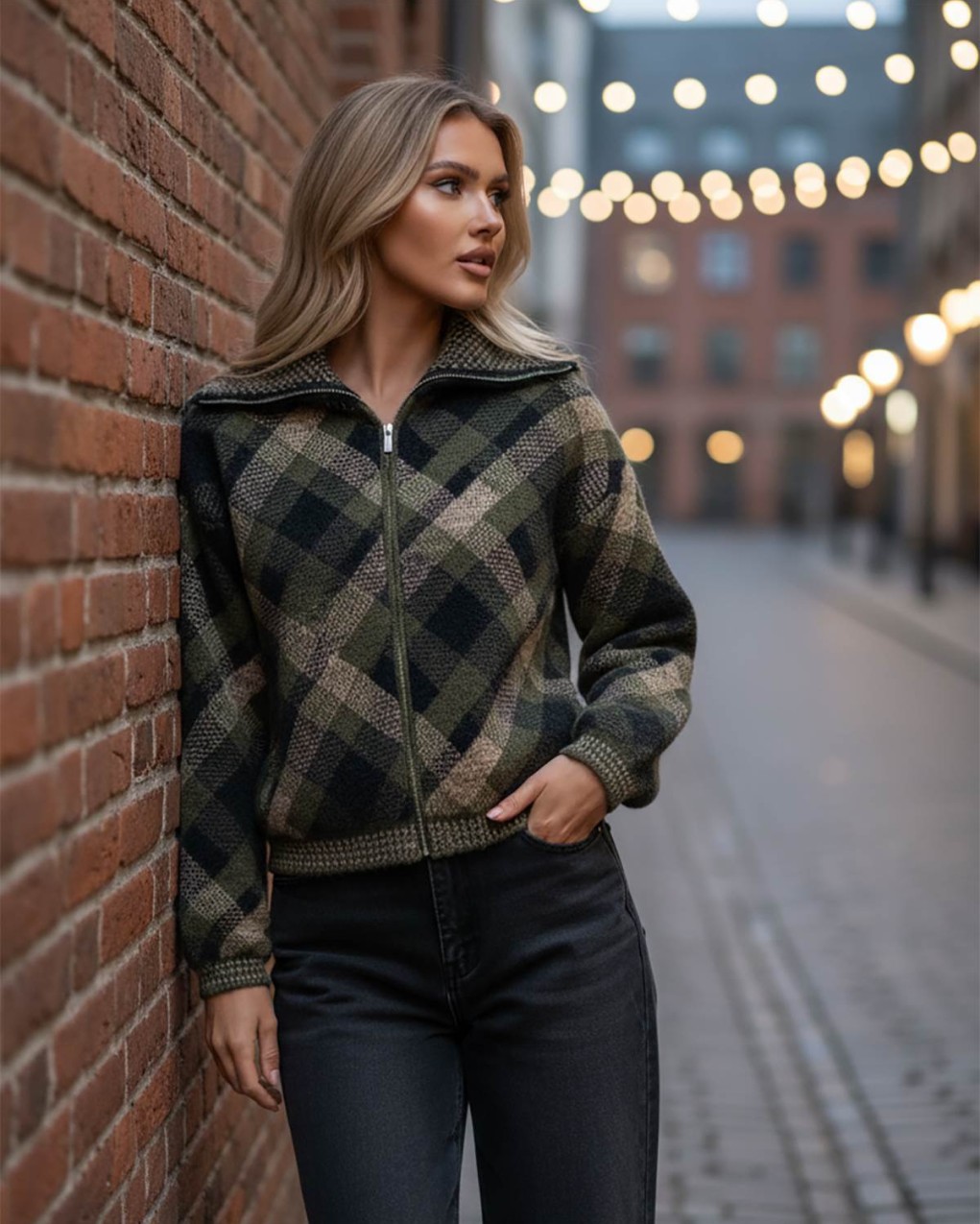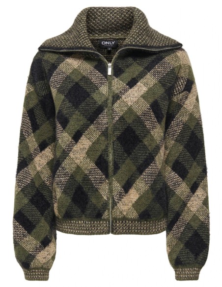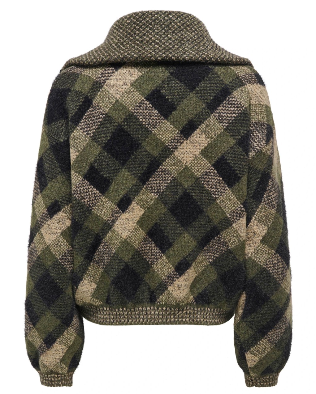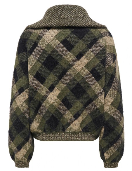 Giubbotto in morbido tessuto effetto lana con motivo a quadri oversize, dotato di pratica zip a mezzo collo. Il taglio comodo e la silhouette oversize lo rendono perfetto per uno stile casual-chic contemporaneo. La texture spazzolata e il pattern classico si combinano in un capo versatile, ideale da abbinare sia a jeans che a gonne.