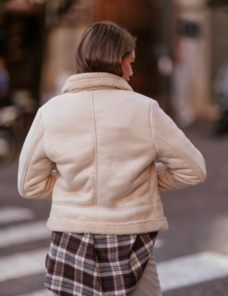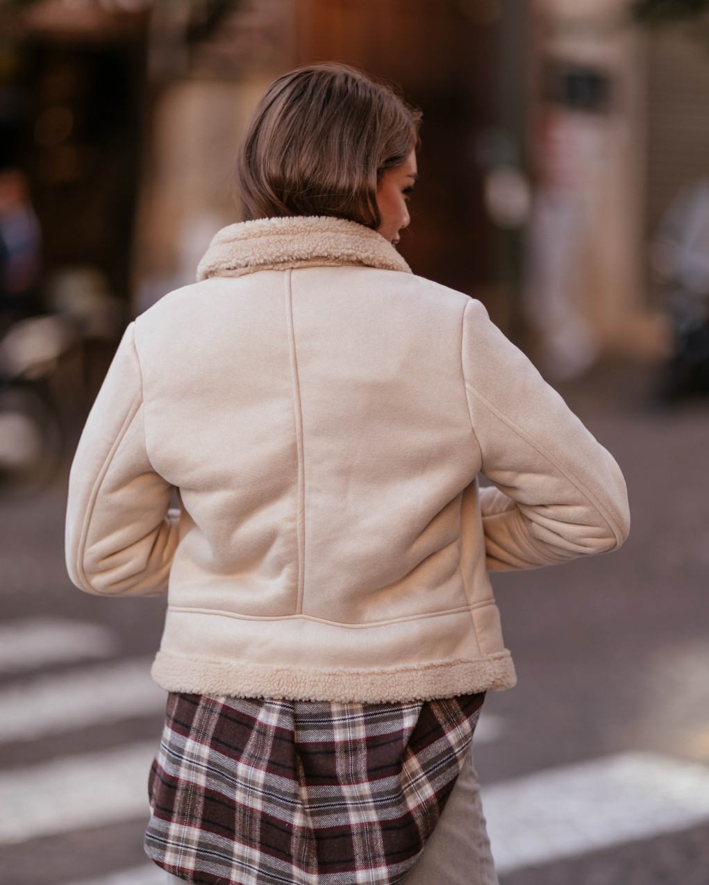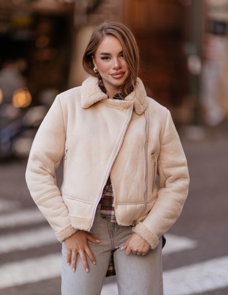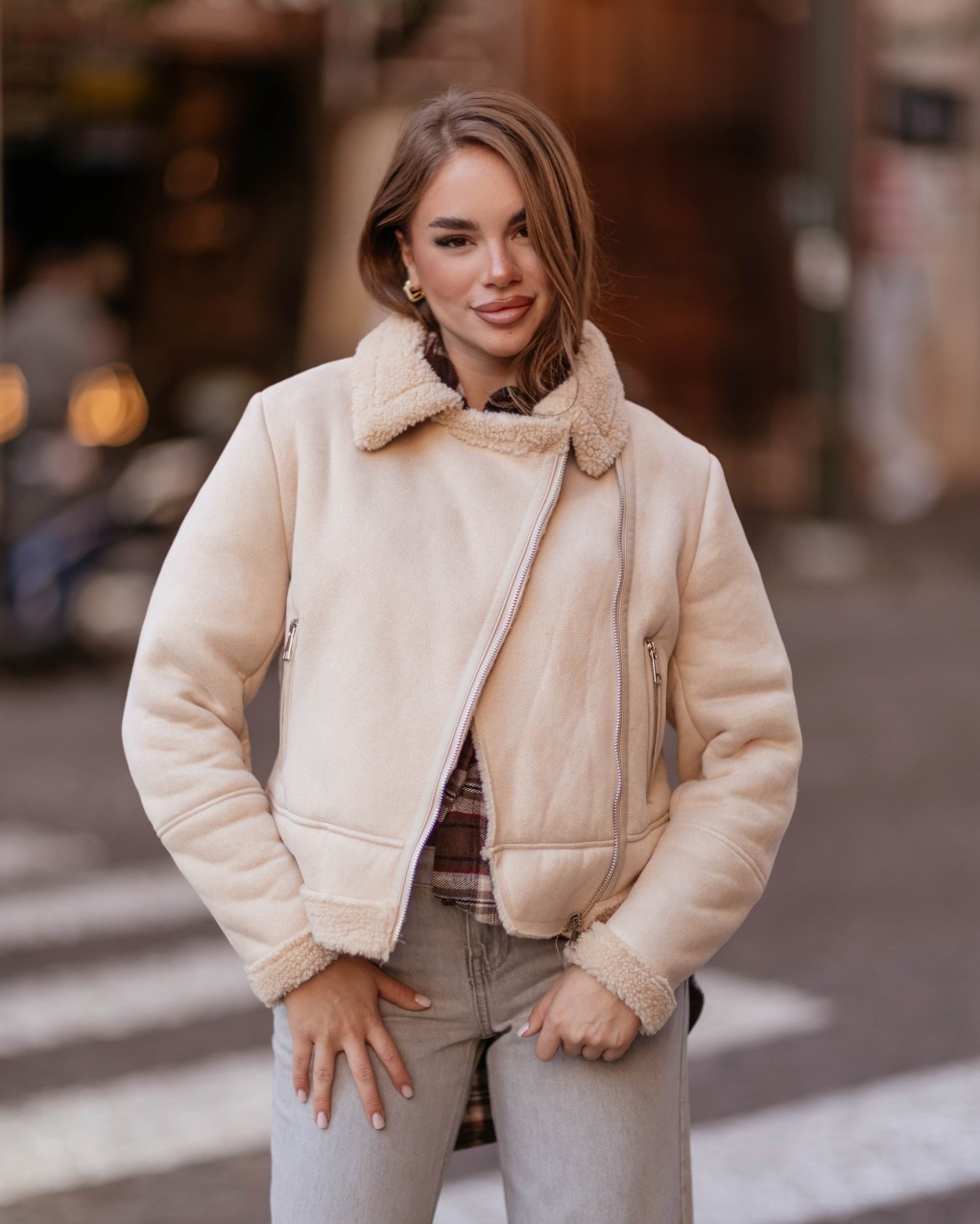 Giacca biker in morbido camoscio sintetico con caldo rivestimento sherpa. Il design presenta una chiusura asimmetrica con zip metallica, ampio collo a bavero e tasche laterali funzionali. La vestibilità corta e leggermente oversize la rende perfetta da abbinare sia con look casual che più ricercati.
