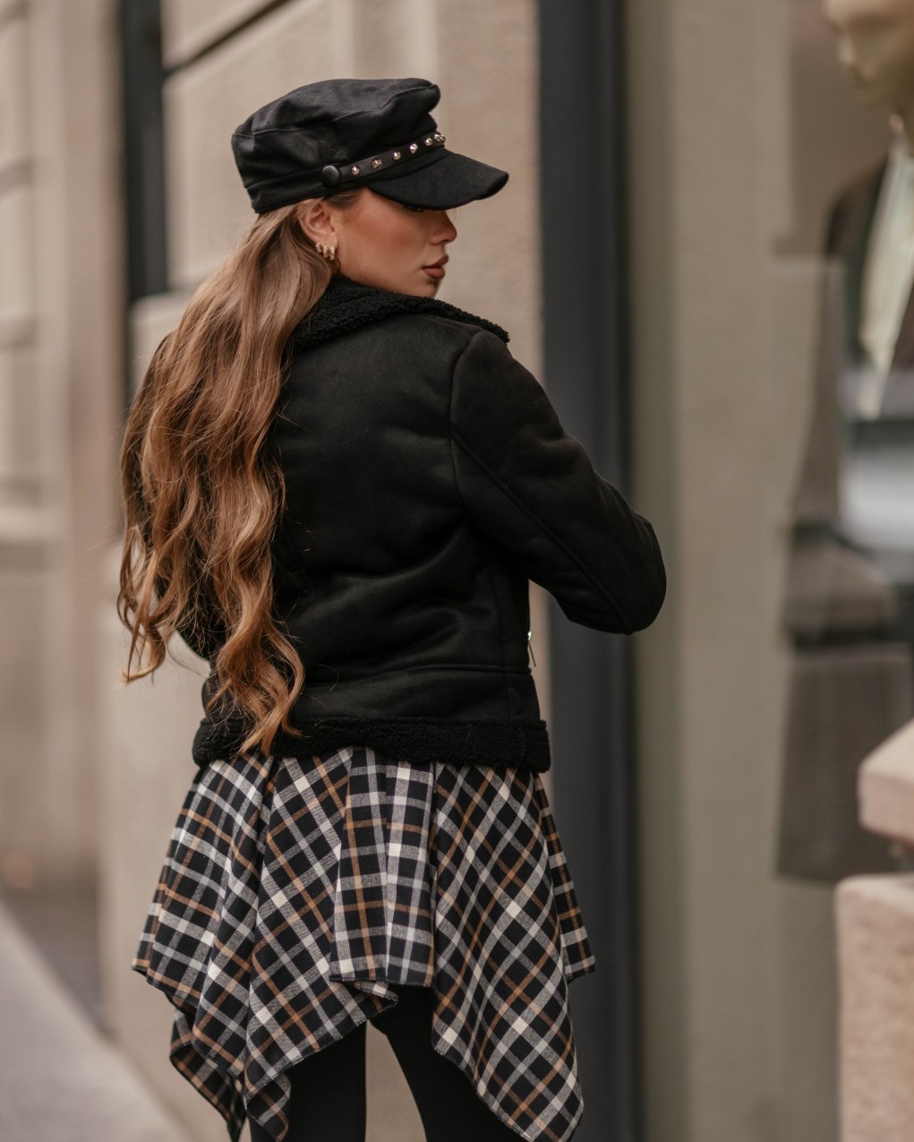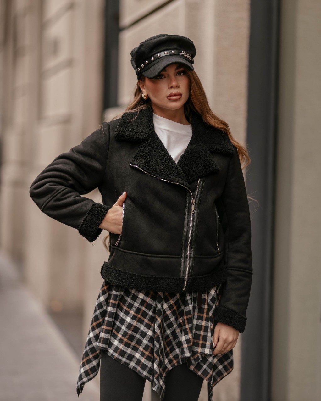 Giacca biker in morbido camoscio sintetico con caldo rivestimento sherpa. Il design presenta una chiusura asimmetrica con zip metallica, ampio collo a bavero e tasche laterali funzionali. La vestibilità corta e leggermente oversize la rende perfetta da abbinare sia con look casual che più ricercati.