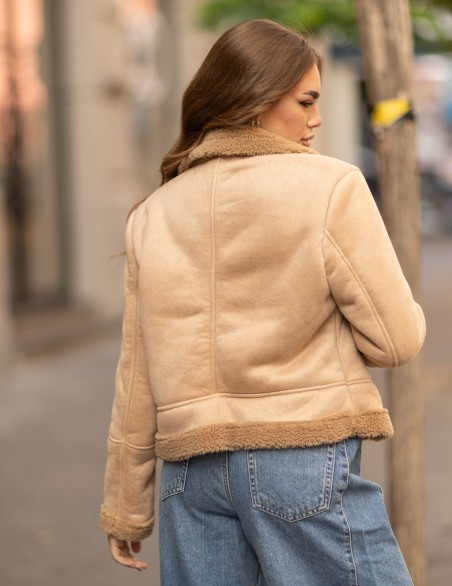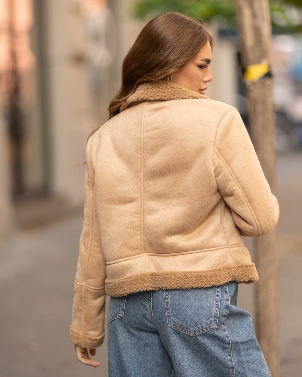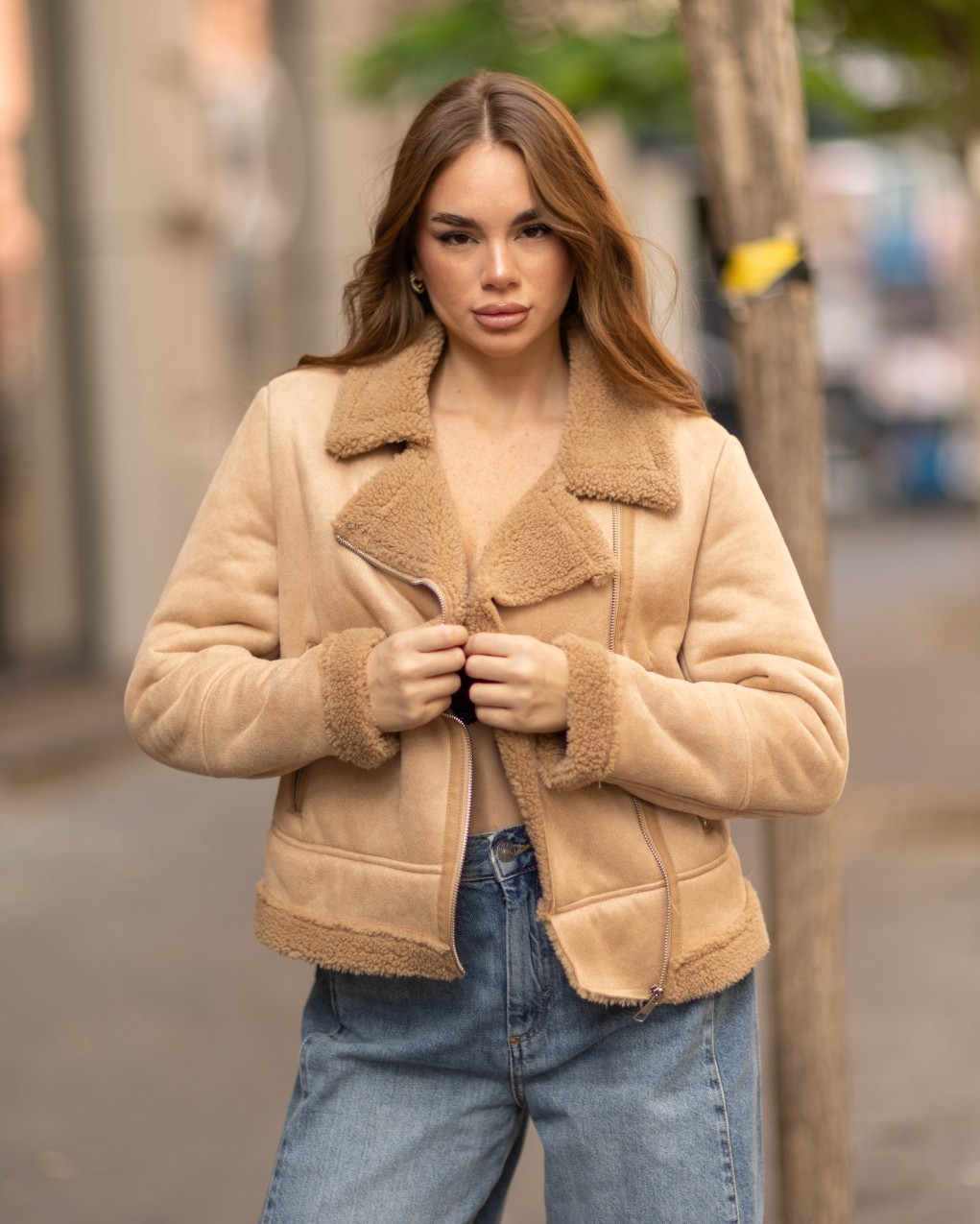 Giacca biker in morbido camoscio sintetico con caldo rivestimento sherpa. Il design presenta una chiusura asimmetrica con zip metallica, ampio collo a bavero e tasche laterali funzionali. La vestibilità corta e leggermente oversize la rende perfetta da abbinare sia con look casual che più ricercati.