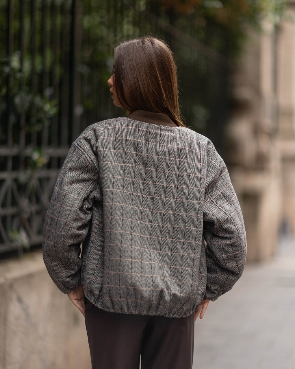 Bomber in tessuto a quadri con elegante design oversize e maniche a palloncino, perfetto per un look contemporaneo e sofisticato. La giacca presenta una raffinata spilla decorativa con catena sul petto e chiusura frontale con zip. Realizzata in morbido tweed con bordi a costine, offre una vestibilità comoda e versatile adatta sia per outfit casual che più ricercati.