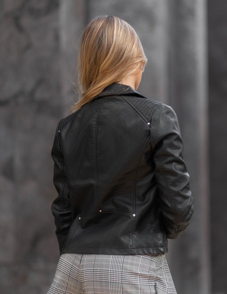 Giacca da motociclista in ecopelle dallo stile rock essenziale e versatile. Realizzata in materiale sintetico di qualità, presenta chiusura asimmetrica con zip, revers a lancia e dettagli impunturati sulle maniche per un look grintoso. La vestibilità slim aderente valorizza la silhouette, mentre le tasche frontali con zip aggiungono funzionalità. Capo perfetto per completare outfit casual-urban con personalità.
