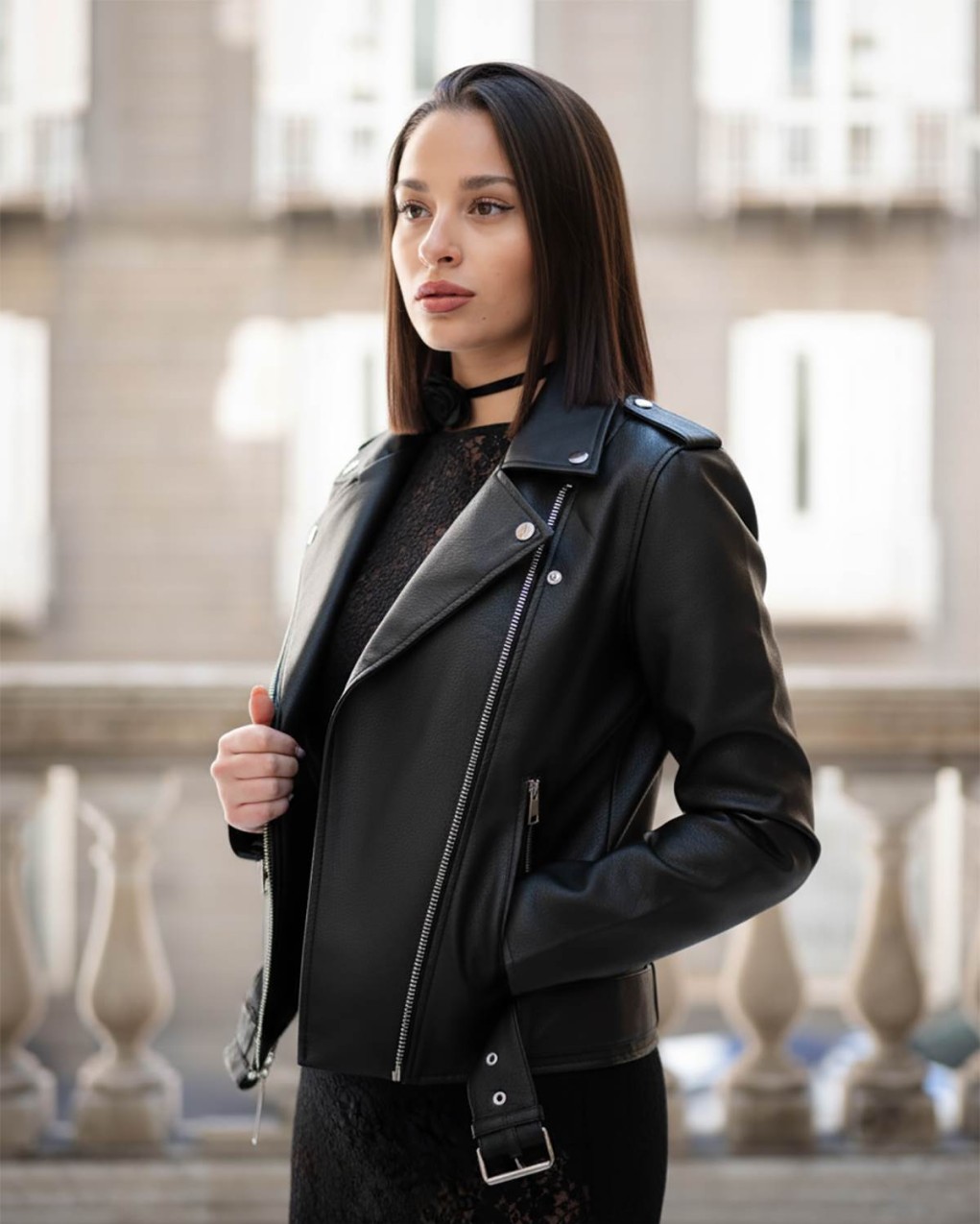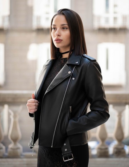 Giacca biker in pelle sintetica di alta qualità con design classico e contemporaneo. Caratterizzata da zip metalliche decorative sui polsi, cintura regolabile in vita e colletto a risvolto. La vestibilità aderente e la struttura sagomata esaltano la silhouette, mentre le cuciture a vista aggiungono un tocco di raffinatezza al capo.