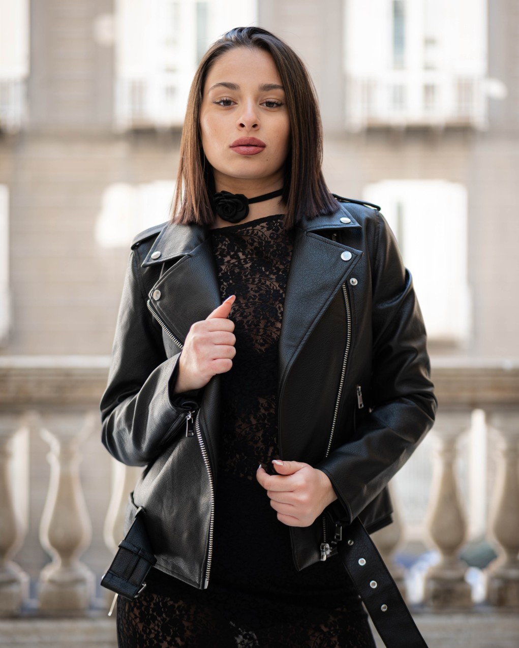 Giacca biker in pelle sintetica di alta qualità con design classico e contemporaneo. Caratterizzata da zip metalliche decorative sui polsi, cintura regolabile in vita e colletto a risvolto. La vestibilità aderente e la struttura sagomata esaltano la silhouette, mentre le cuciture a vista aggiungono un tocco di raffinatezza al capo.