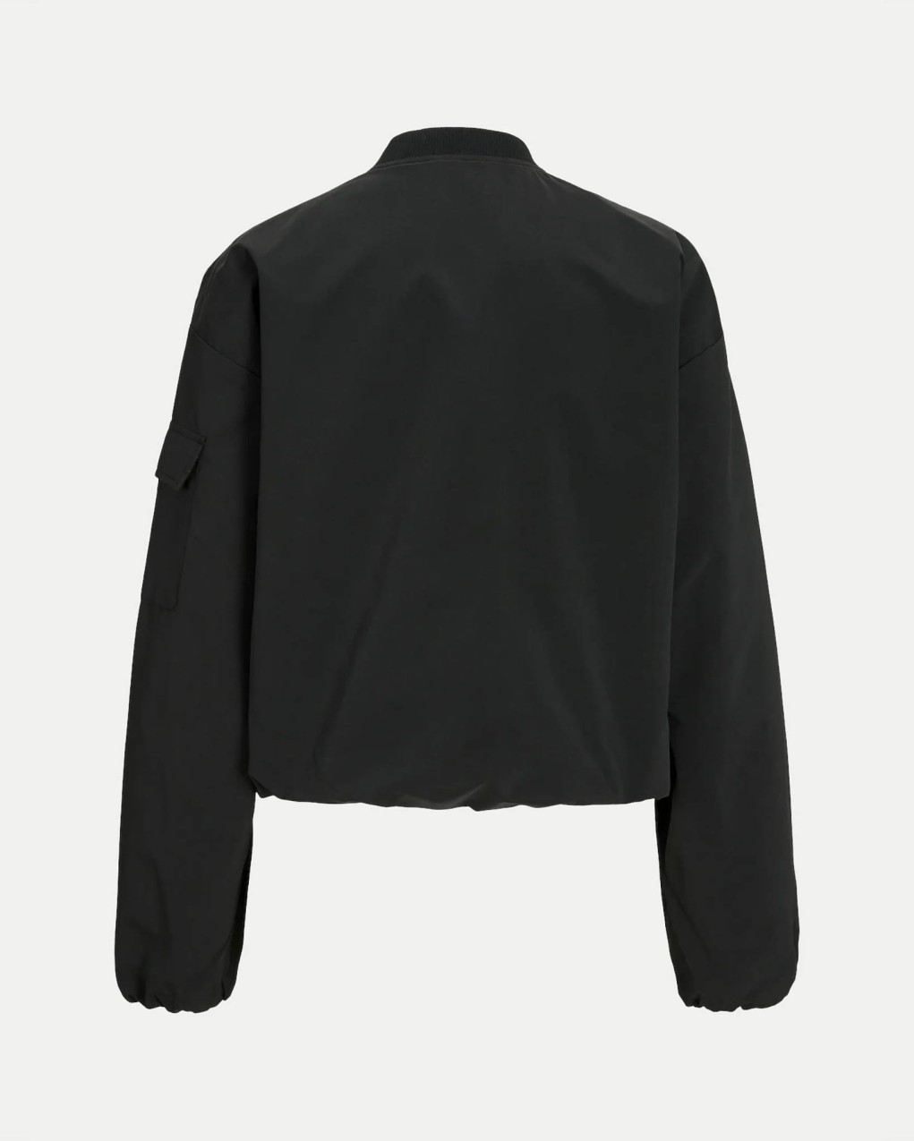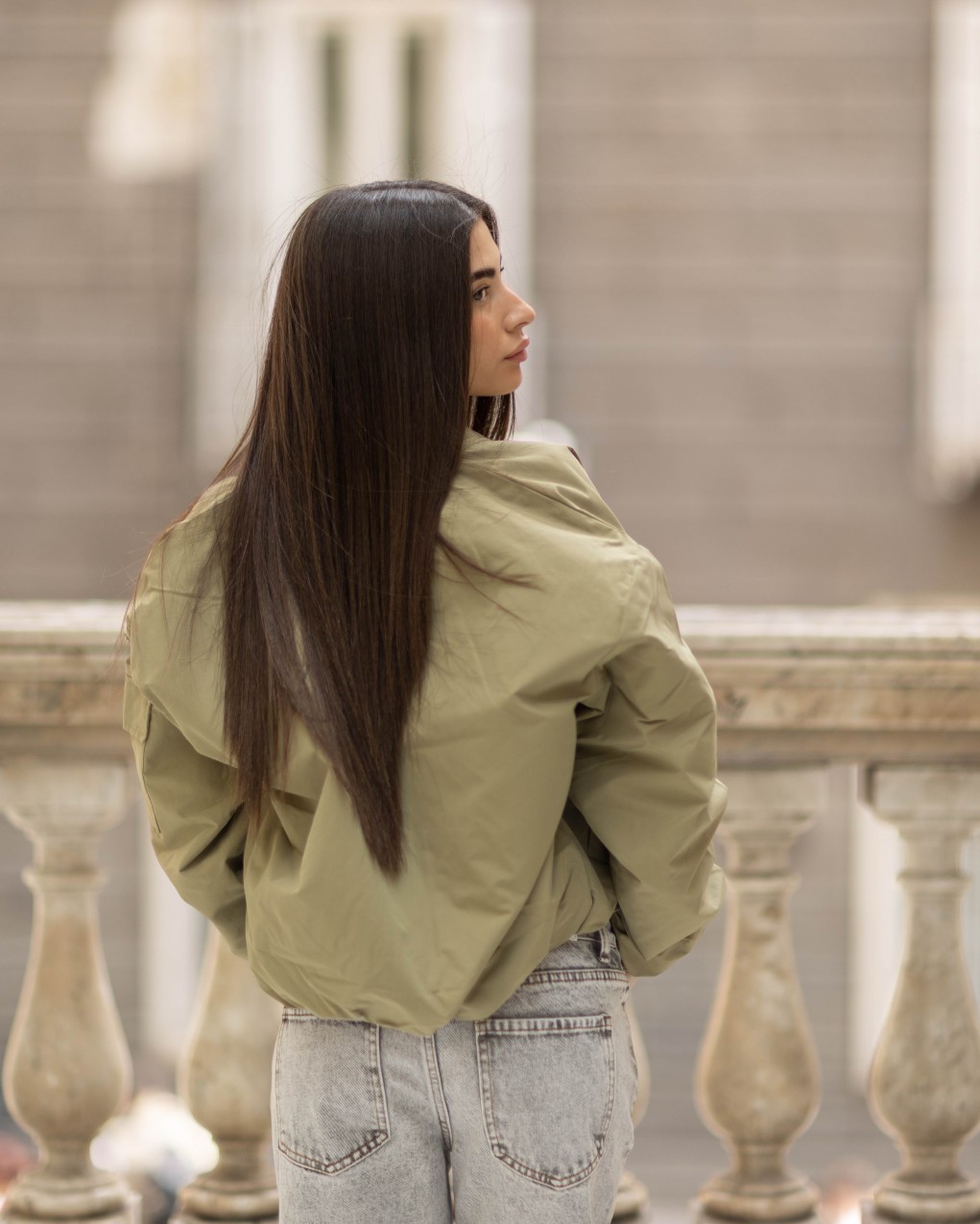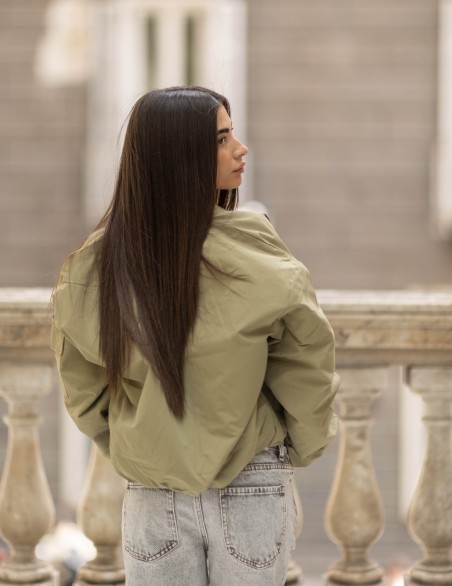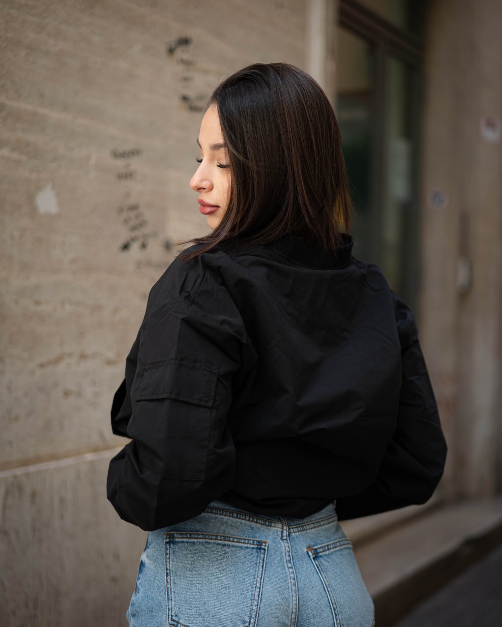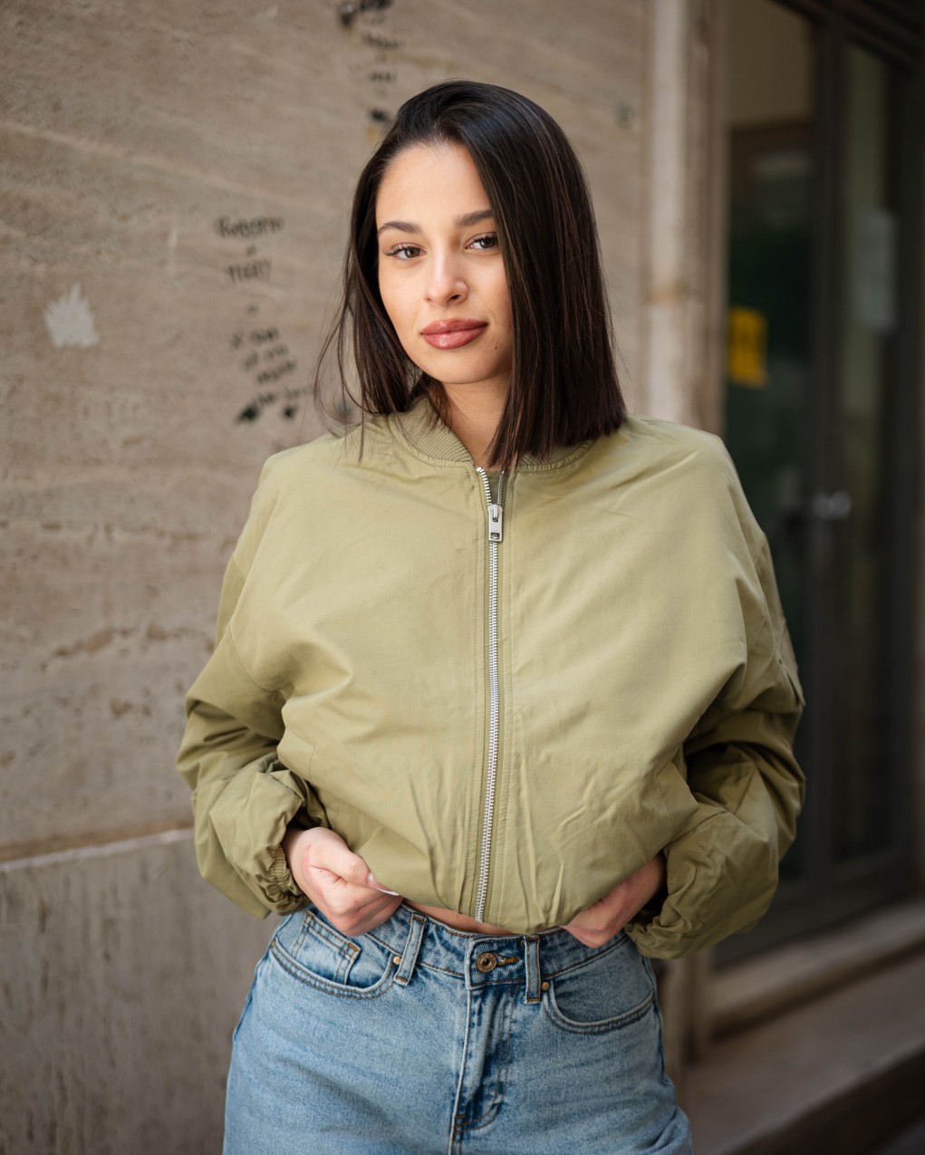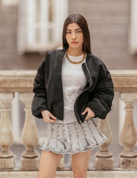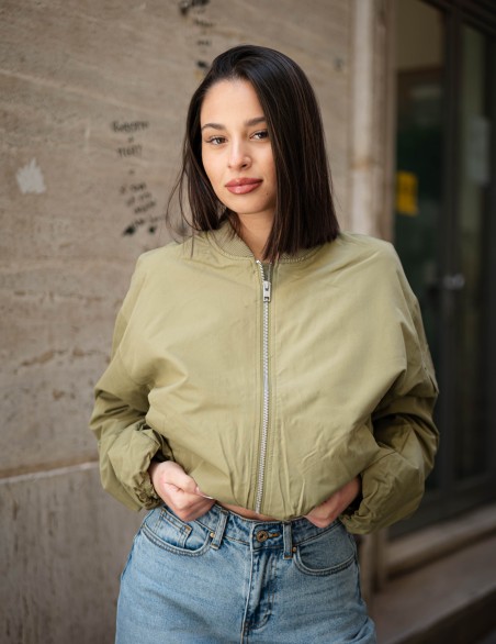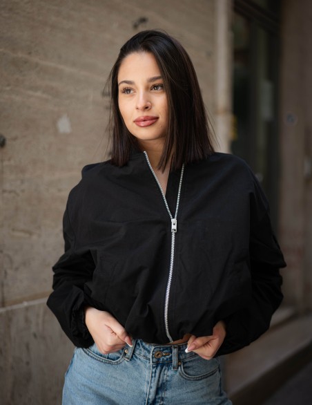 Bomber jacket dallo stile urban-contemporaneo, perfetto per completare look casual e streetwear. Realizzato in tessuto resistente con finitura opaca, presenta chiusura con zip frontale, girocollo e maniche a palloncino che conferiscono un tocco di volume moderno. La vestibilità è oversize e rilassata, ideale da indossare sopra maglie e felpe per un outfit versatile e di tendenza.