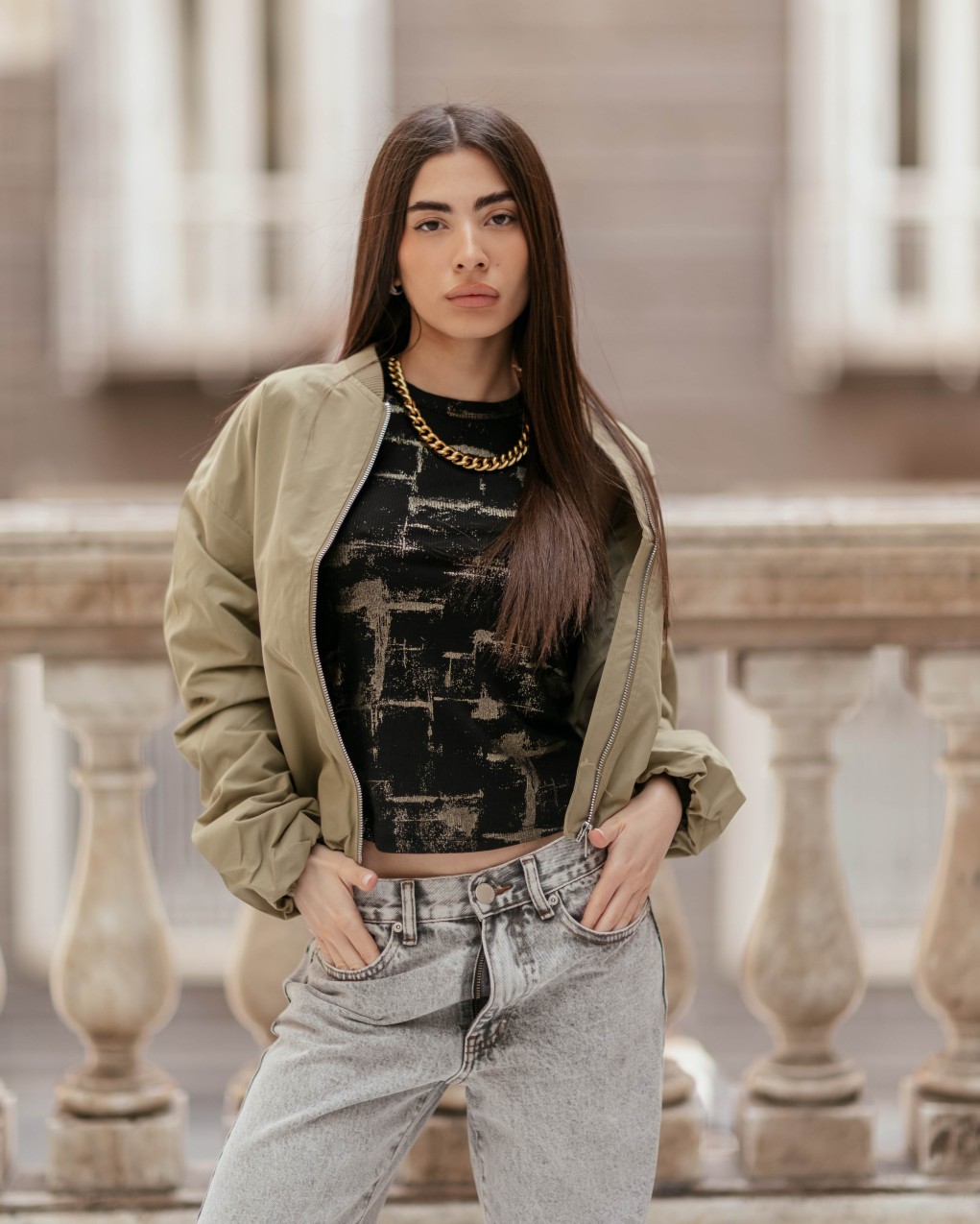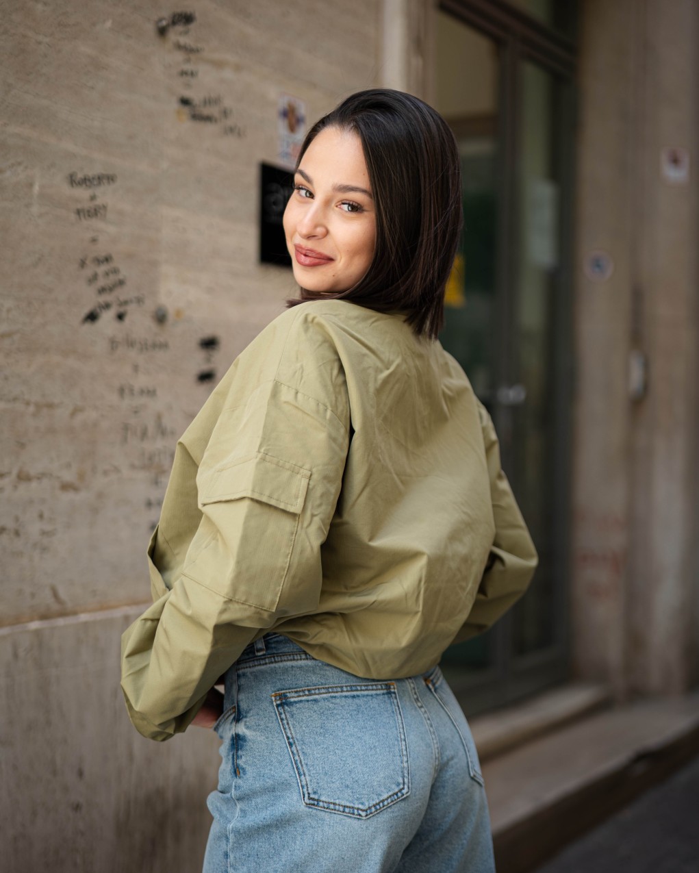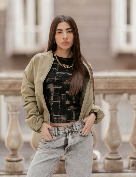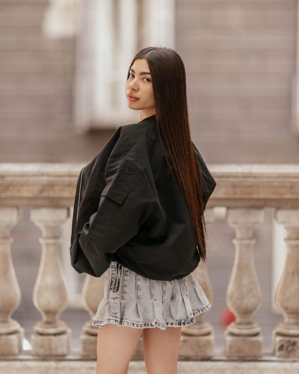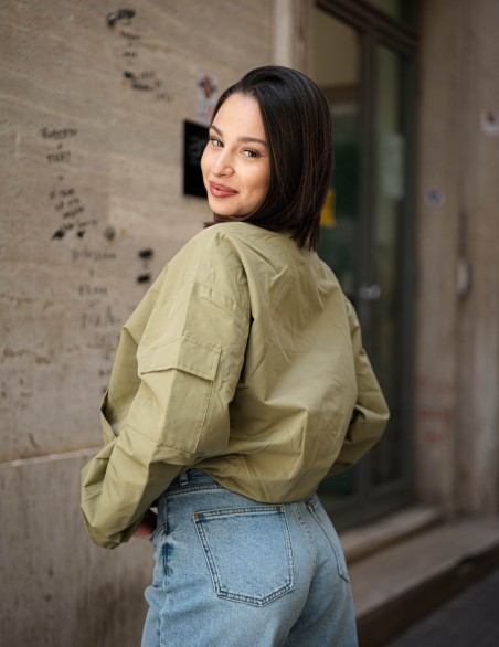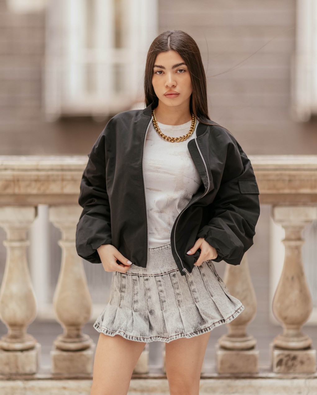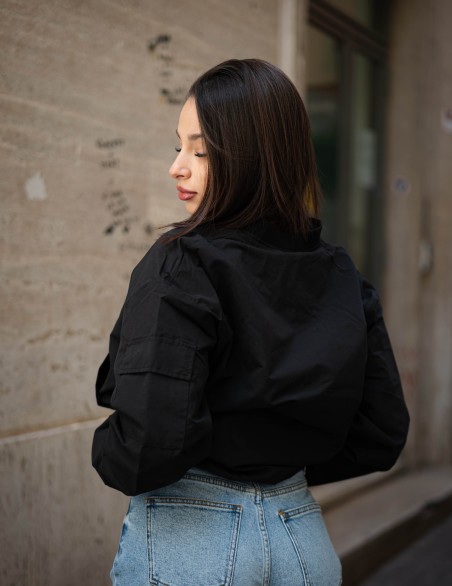 Bomber jacket dallo stile urban-contemporaneo, perfetto per completare look casual e streetwear. Realizzato in tessuto resistente con finitura opaca, presenta chiusura con zip frontale, girocollo e maniche a palloncino che conferiscono un tocco di volume moderno. La vestibilità è oversize e rilassata, ideale da indossare sopra maglie e felpe per un outfit versatile e di tendenza.