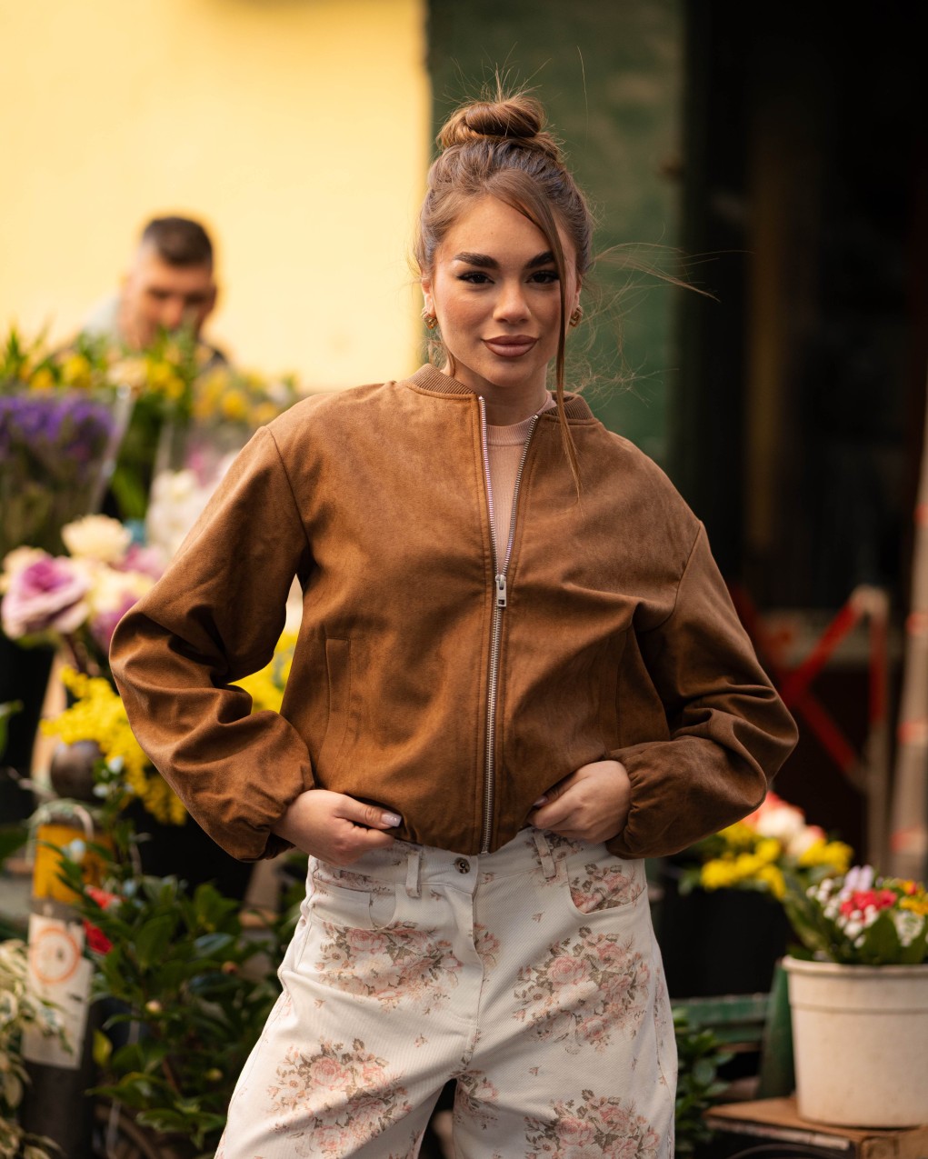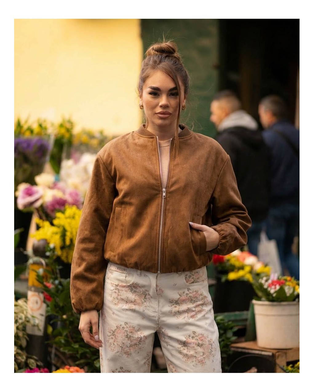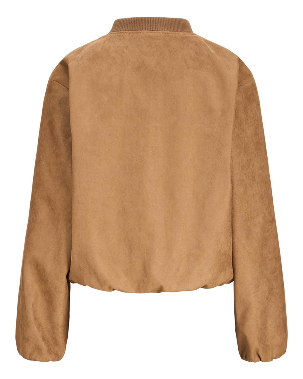 Bomber jacket in morbido materiale effetto scamosciato, caratterizzato da chiusura zip frontale e collo a fascia. Il design presenta maniche lunghe raglan con polsini elasticizzati e orlo inferiore a costine per una vestibilità comoda e strutturata. Capo versatile dallo stile casual-chic, perfetto per completare look contemporanei con una silhouette leggermente oversize che garantisce libertà di movimento.