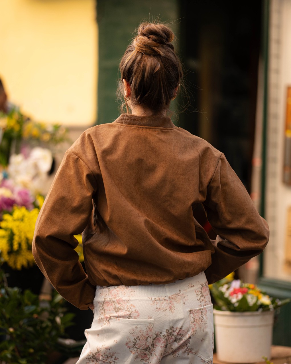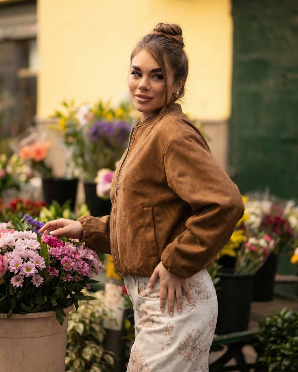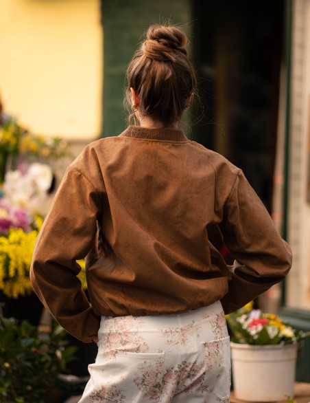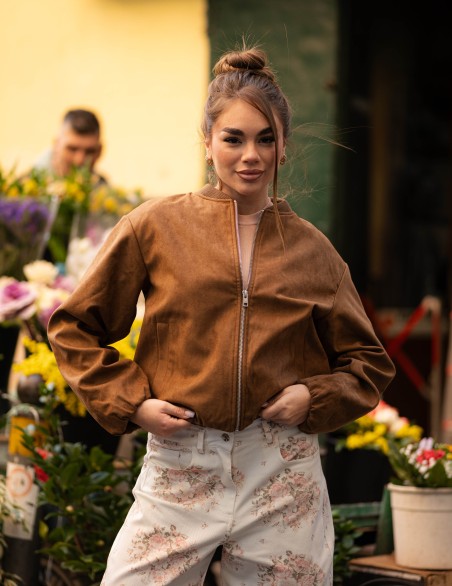 Bomber jacket in morbido materiale effetto scamosciato, caratterizzato da chiusura zip frontale e collo a fascia. Il design presenta maniche lunghe raglan con polsini elasticizzati e orlo inferiore a costine per una vestibilità comoda e strutturata. Capo versatile dallo stile casual-chic, perfetto per completare look contemporanei con una silhouette leggermente oversize che garantisce libertà di movimento.