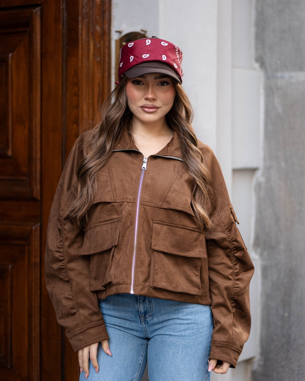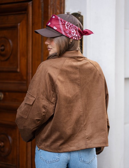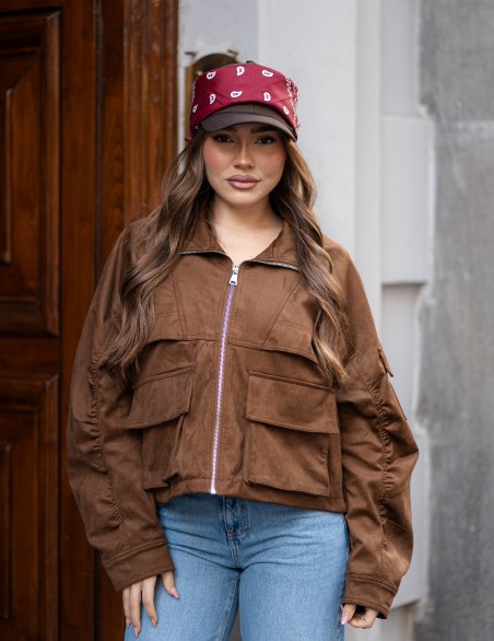 Giacca utility dallo stile urban contemporary, realizzata inecodainetto. Caratterizzata da multiple tasche cargo applicate sul fronte e chiusura con zip centrale, offre un look funzionale e di tendenza. Il taglio è corto e oversize, con maniche lunghe e dettagli pratici che la rendono versatile per outfit casual quotidiani. Vestibilità comoda e rilassata, perfetta da abbinare a pantaloni a vita alta.