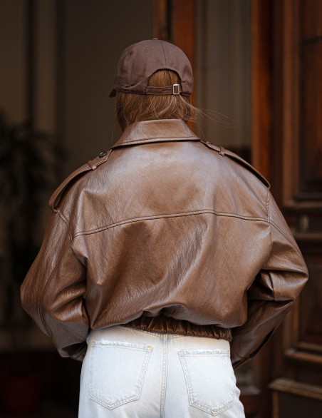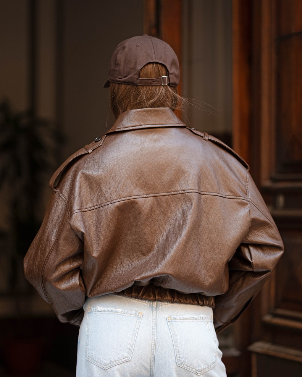 Giacca bomber in ecopelle dallo stile urban contemporaneo, perfetta per un look casual e di tendenza. Il design presenta ampie tasche frontali con patta, chiusura con zip e pratica cintura in vita regolabile per definire la silhouette. Realizzata in materiale sintetico effetto pelle di alta qualità, offre un fit oversize rilassato con maniche voluminose e polsini con bottoni. Ideale per la mezza stagione, si abbina facilmente a jeans e outfit casual per un tocco di carattere.
