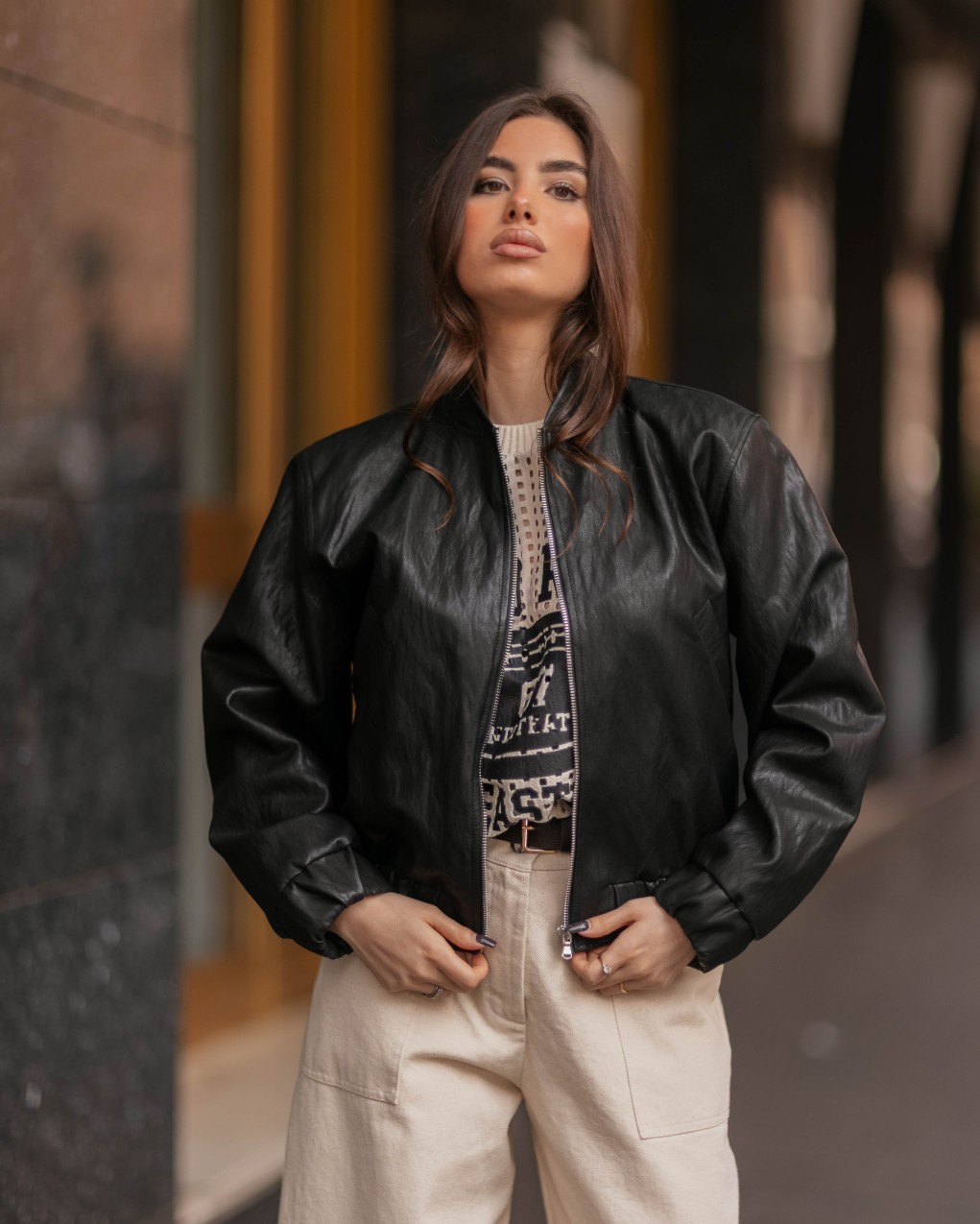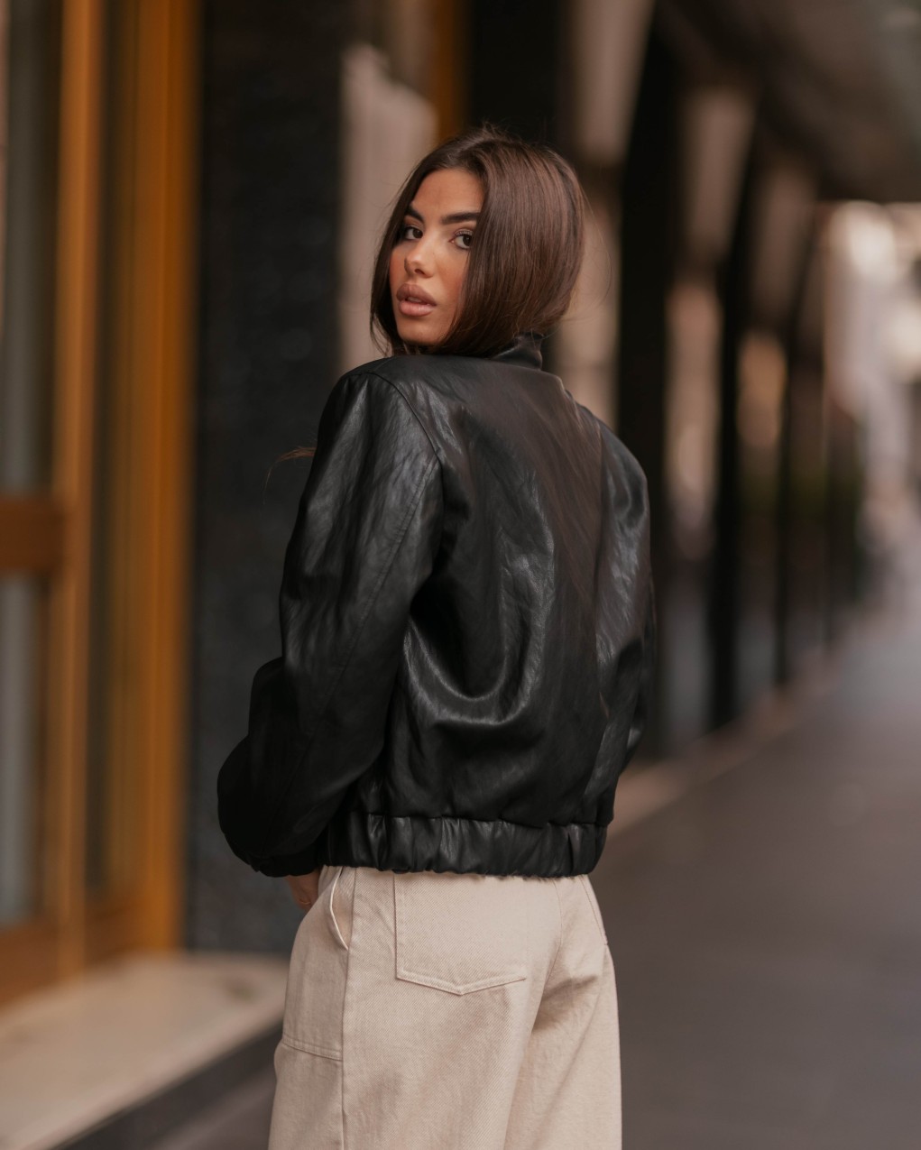 Bomber jacket in pelle sintetica dallo stile urban contemporaneo, perfetto per un look casual-chic. Realizzato in ecopelle di alta qualità con finitura effetto pelle, presenta chiusura frontale con zip, colletto alla coreana e polsini elasticizzati. La vestibilità è regolare con linea morbida e spalle leggermente scese, ideale da abbinare sia a outfit sportivi che eleganti per un tocco rock and roll.