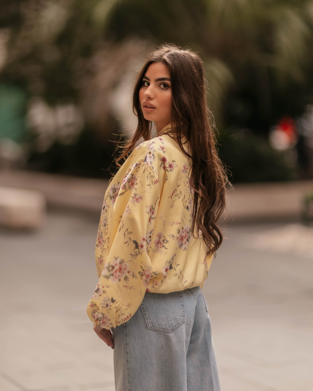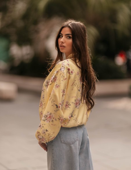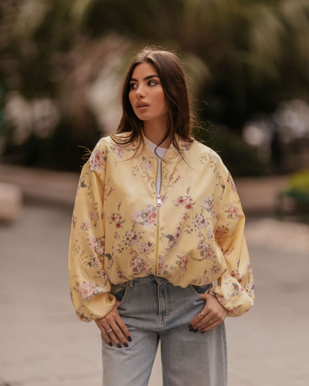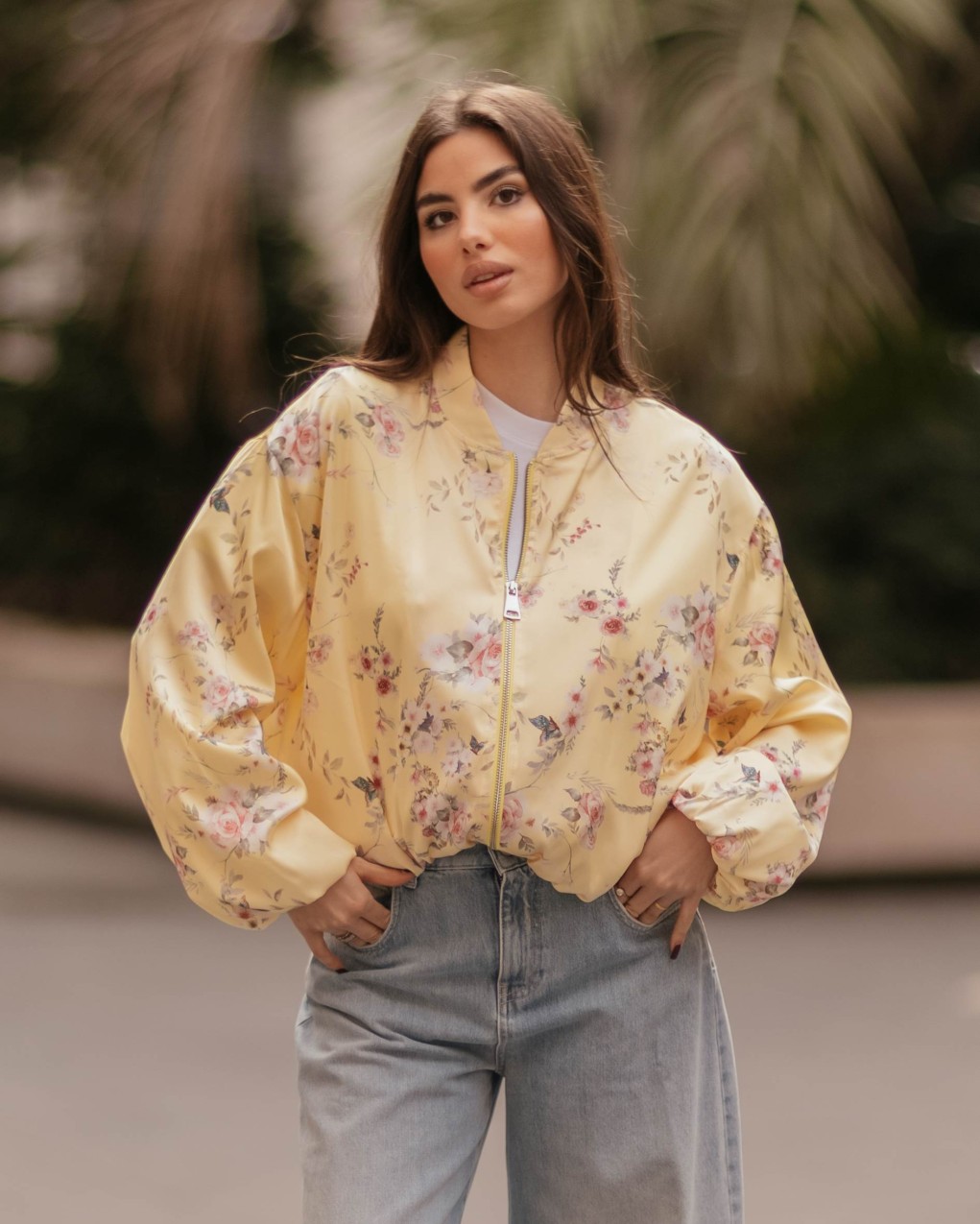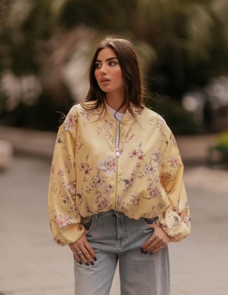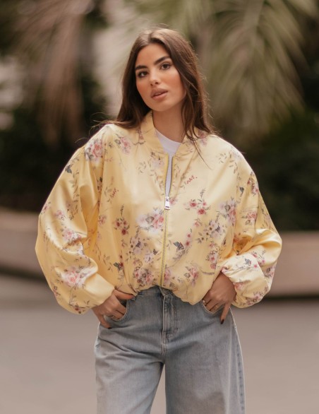 Bomber jacket in stile femminile con elegante stampa floreale su tutta la superficie. Realizzato in tessuto satinato lucido di alta qualità, presenta chiusura frontale con zip, polsini e orlo elasticizzati per una vestibilità comoda e strutturata. Il taglio oversize con maniche a palloncino voluminose crea una silhouette moderna e di tendenza, perfetta per look casual-chic. Capo versatile ideale per la mezza stagione, da abbinare a jeans o pantaloni per un outfit contemporaneo.