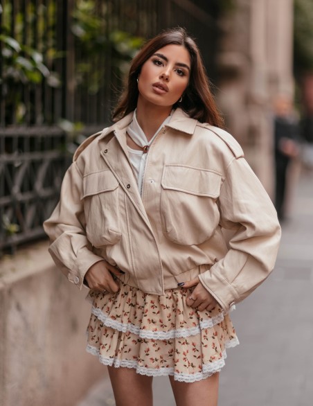 Giacca bomber in ecopelle dallo stile urban contemporaneo, perfetta per outfit casual-chic. Caratterizzata da design oversize con spalle strutturate, doppia tasca a filetto sul petto e chiusura frontale con zip. Realizzata in similpelle di qualità con finitura matte, presenta collo classico e polsini con bottoni a pressione. La vestibilità ampia e comoda garantisce un look trendy e versatile, ideale per la mezza stagione.