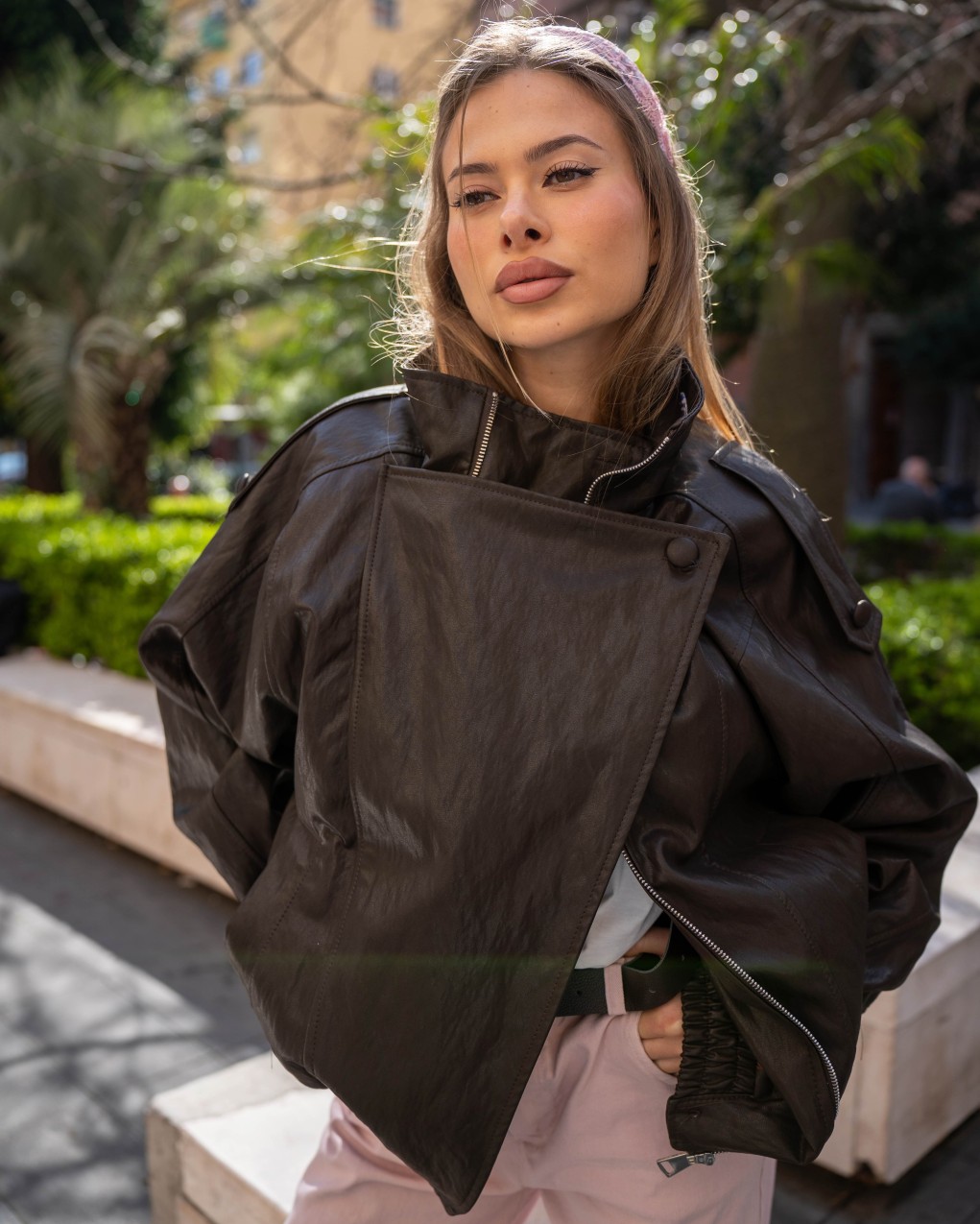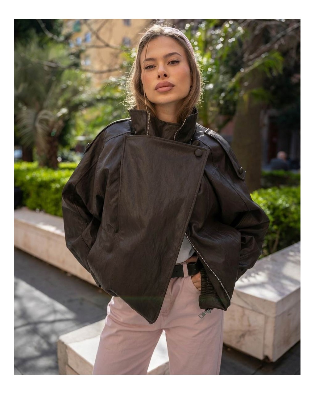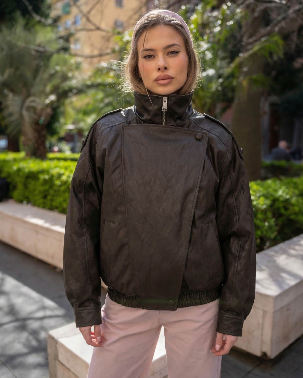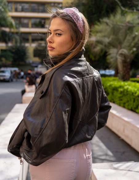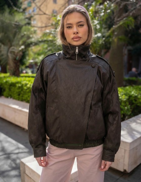 Bomber in ecopelle, modello maniche lunghe, doppiopetto, arricciatura con elastico in vita, chiusura davanti con zip nascosta. Vestibilità ampia.