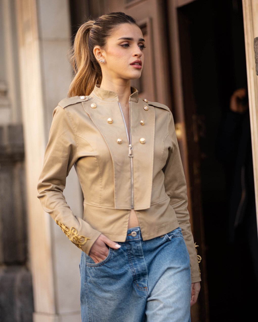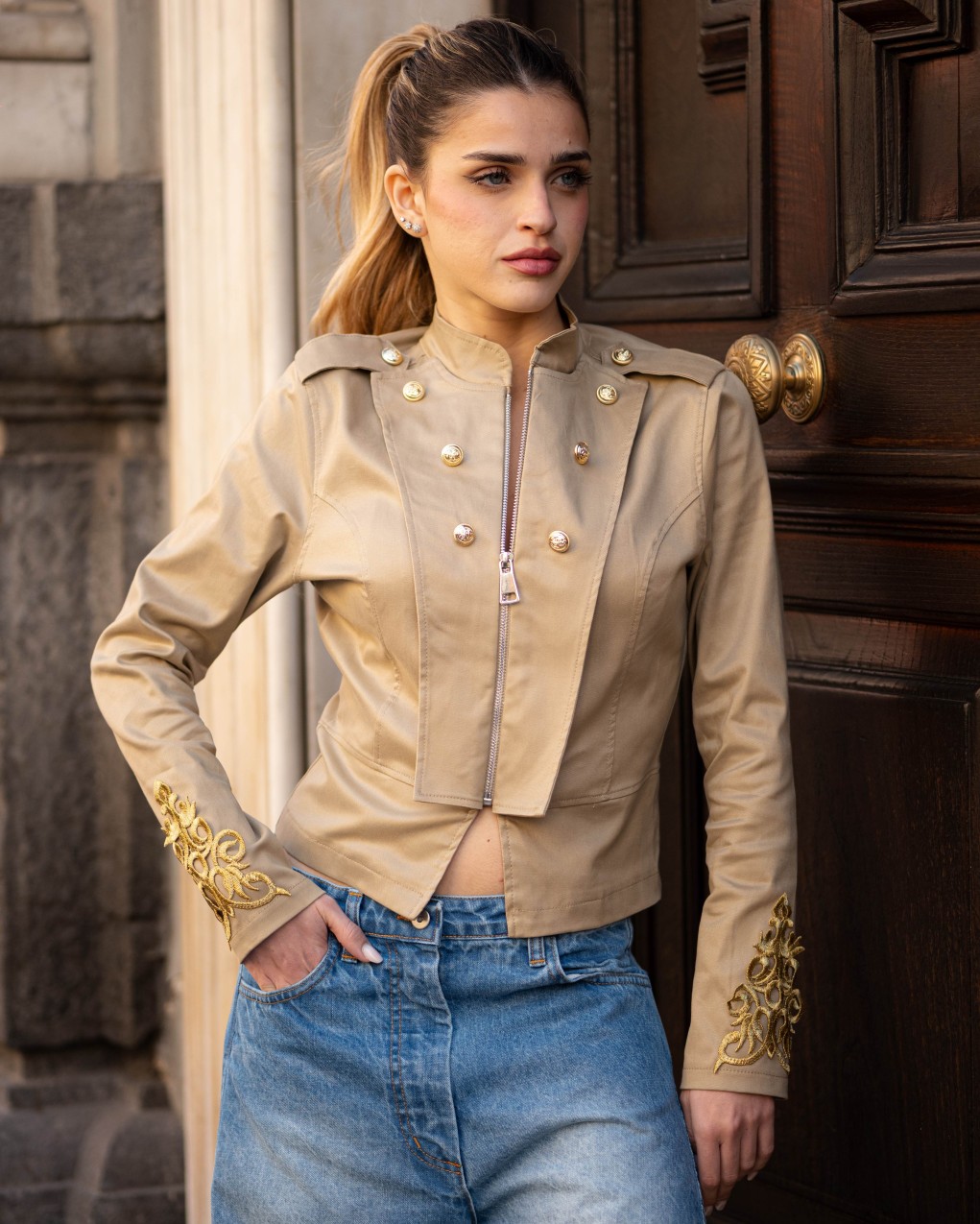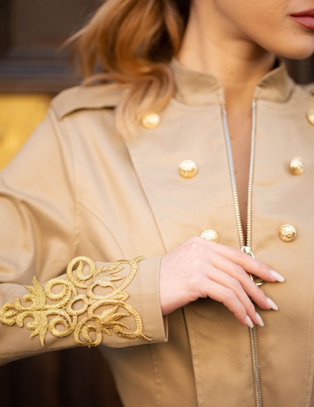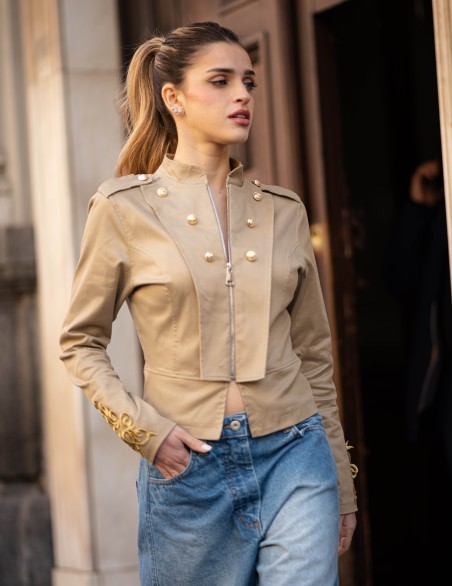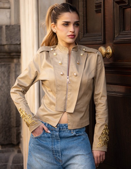 Giacca corta da donna in stile militare con chiusura frontale a zip e collo alla coreana. Presenta dettagli decorativi con bottoni dorati sulla parte anteriore, spalline strutturate e ricami ornamentali sui polsini. Realizzata in tessuto resistente con vestibilità aderente che valorizza la silhouette, perfetta per un look sofisticato e grintoso. Ideale da abbinare sia a pantaloni casual che a outfit più eleganti.