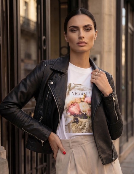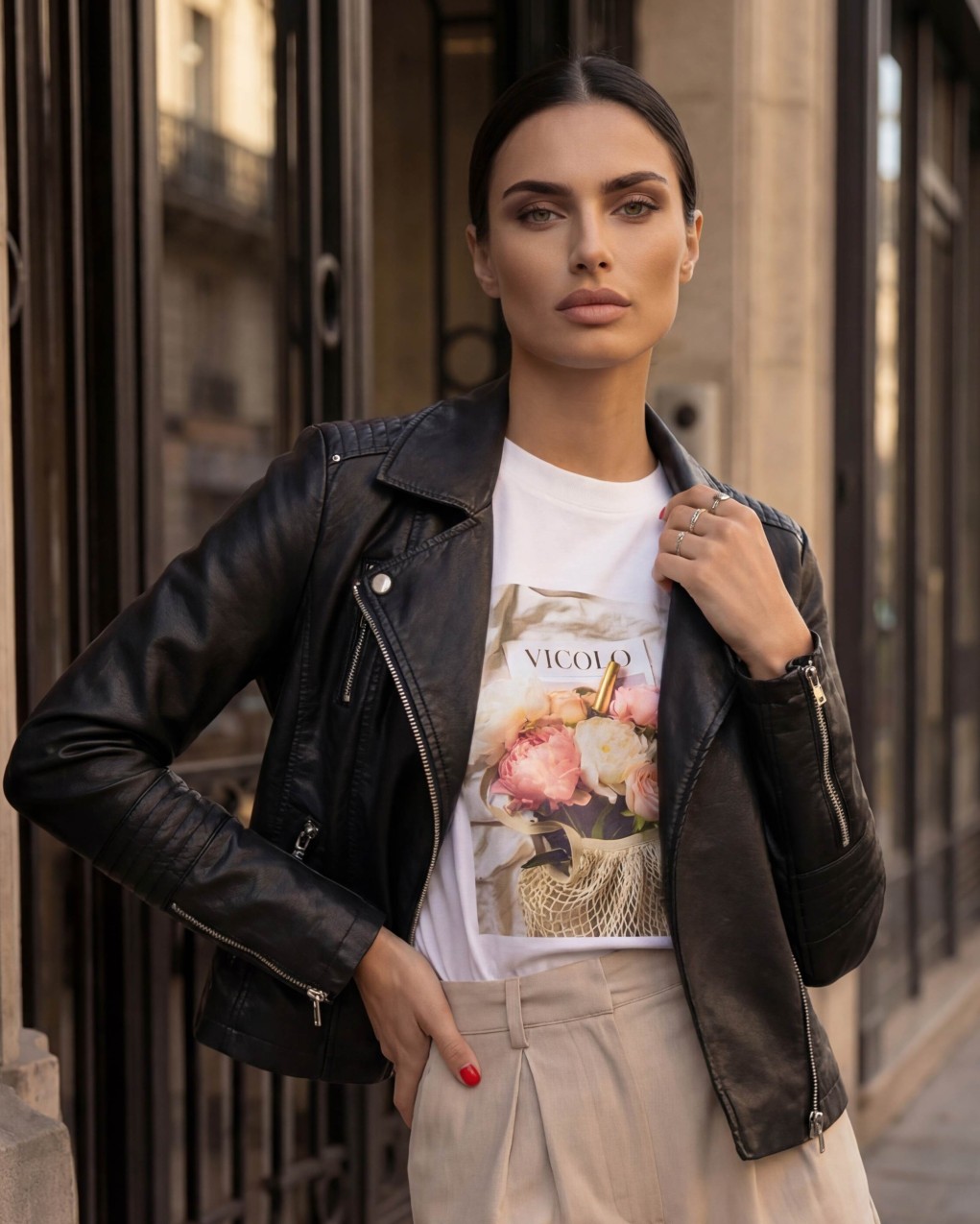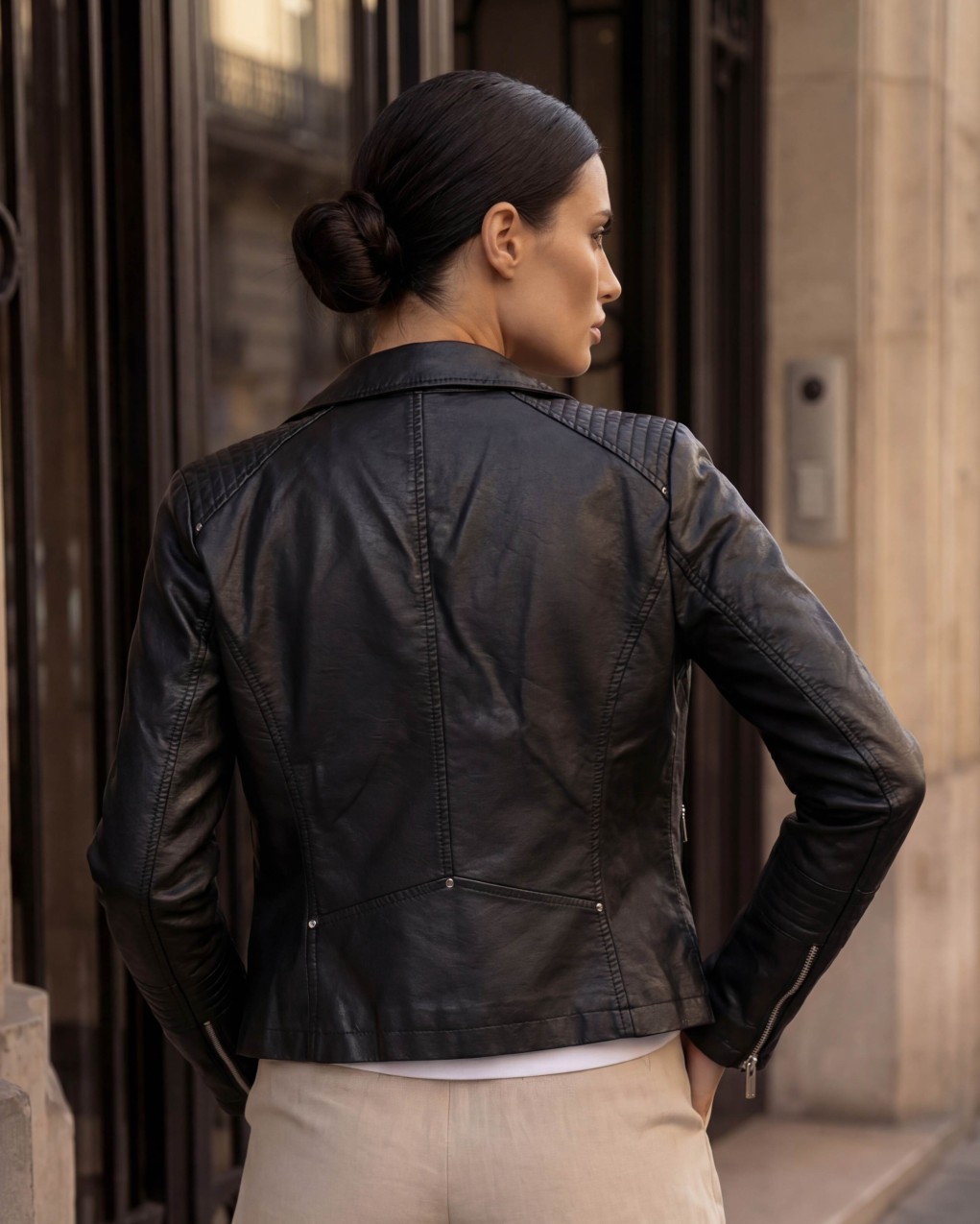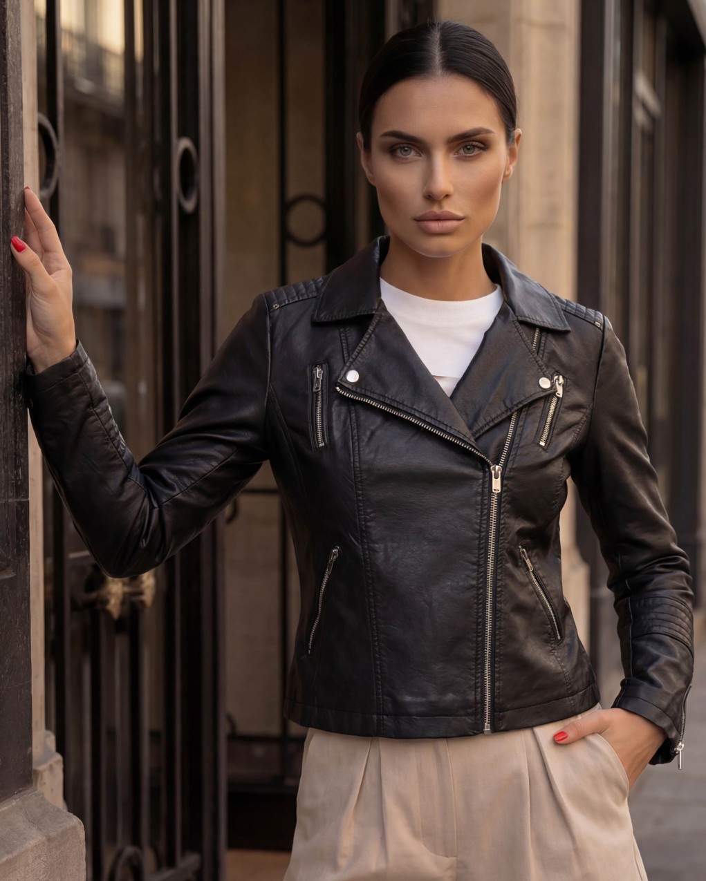 Giacca da motociclista in ecopelle dallo stile rock essenziale e versatile. Realizzata in materiale sintetico di qualità, presenta chiusura asimmetrica con zip, revers a lancia e dettagli impunturati sulle maniche per un look grintoso. La vestibilità slim aderente valorizza la silhouette, mentre le tasche frontali con zip aggiungono funzionalità. Capo perfetto per completare outfit casual-urban con personalità.