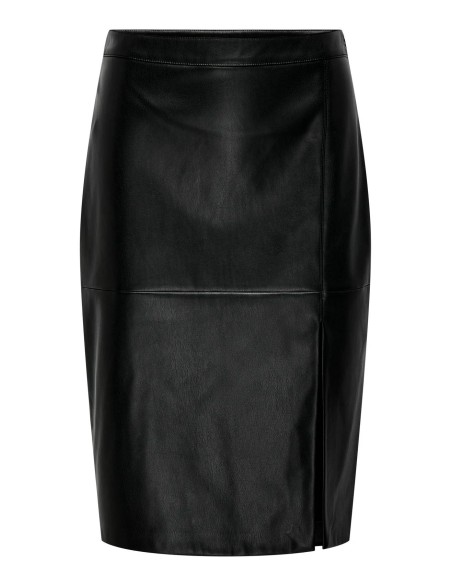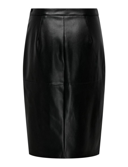 La gonna è realizzata in ecopelle nera, con una superficie liscia e leggermente lucida che le conferisce un aspetto elegante e moderno